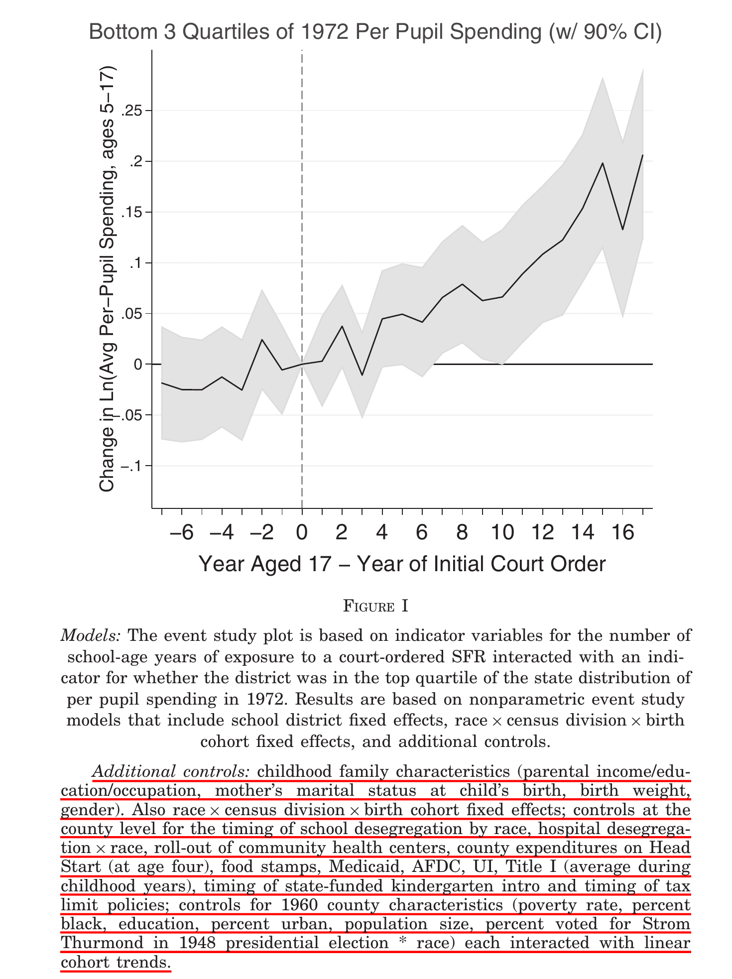 Jackson et al 2016 used various court decisions to change school funding in various districts the last many decades. Since court decisions are sort of randomly imposed (we can maybe assume), then variation in funding that is due to such court orders is plausibly random in origin and can be used to estimate causal effects. They specifically note the problems with using ‘natural’ existing variation: