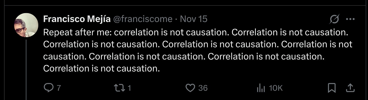 Note how I didn’t say this cross-sectional scatterplot proves anything about causality, but we will get to that later.