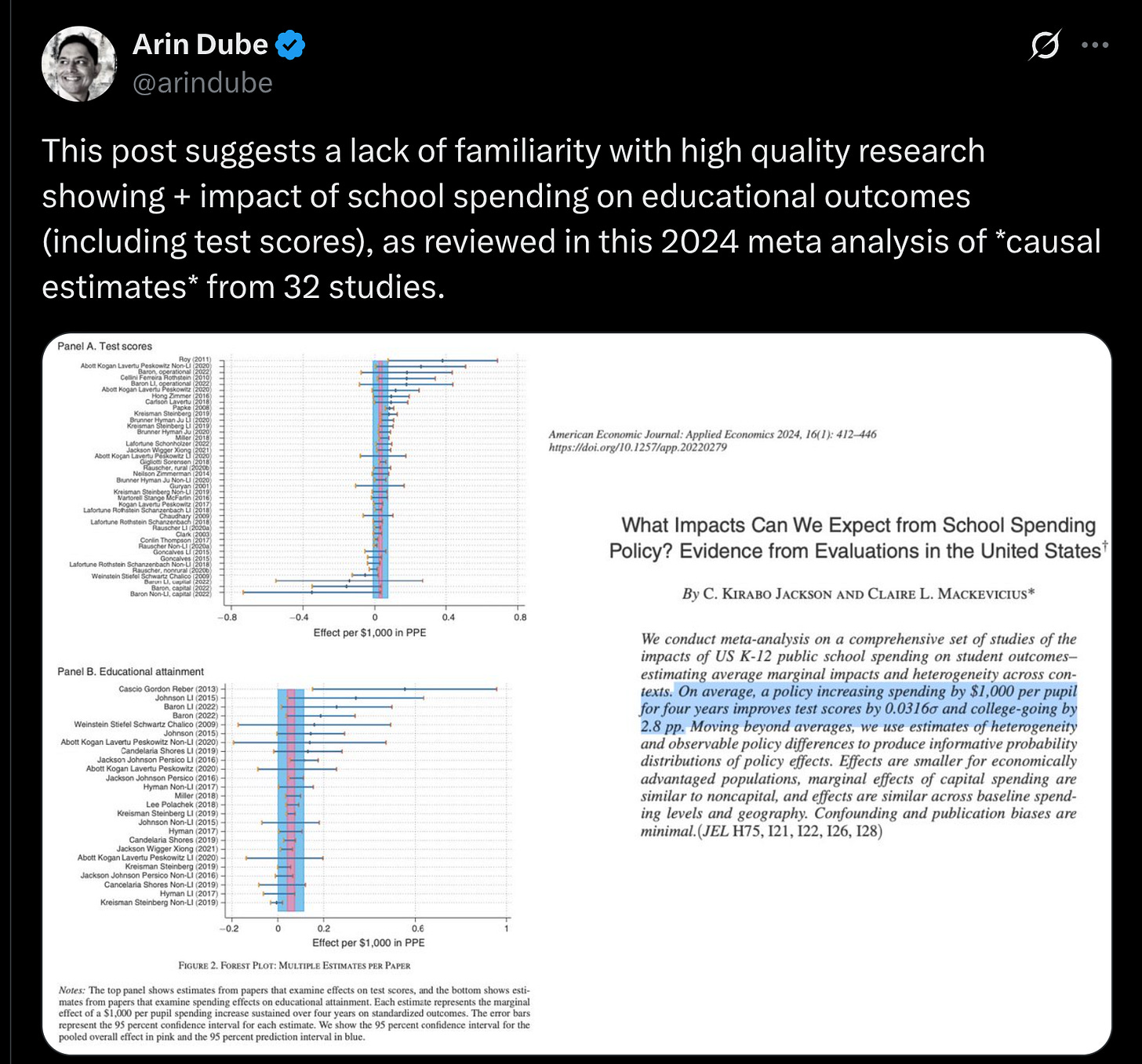 But even assuming it’s real, which frankly is a generous assumption (apparently only 3 papers even estimated the effect on college enrollment and most of the studies that were used to estimate the effect on college enrollment were actually about high-school graduation), it’s not clear that we should care about it because the fact that money doesn’t seem to have a practically significant effect on test scores raise questions about the mechanism. For instance, we could imagine that money helps increase college enrollment because it allows schools to hire someone to help students apply to college, but if their test scores are left mostly unchanged it’s not clear that it would increase their college graduation rate or future earnings.