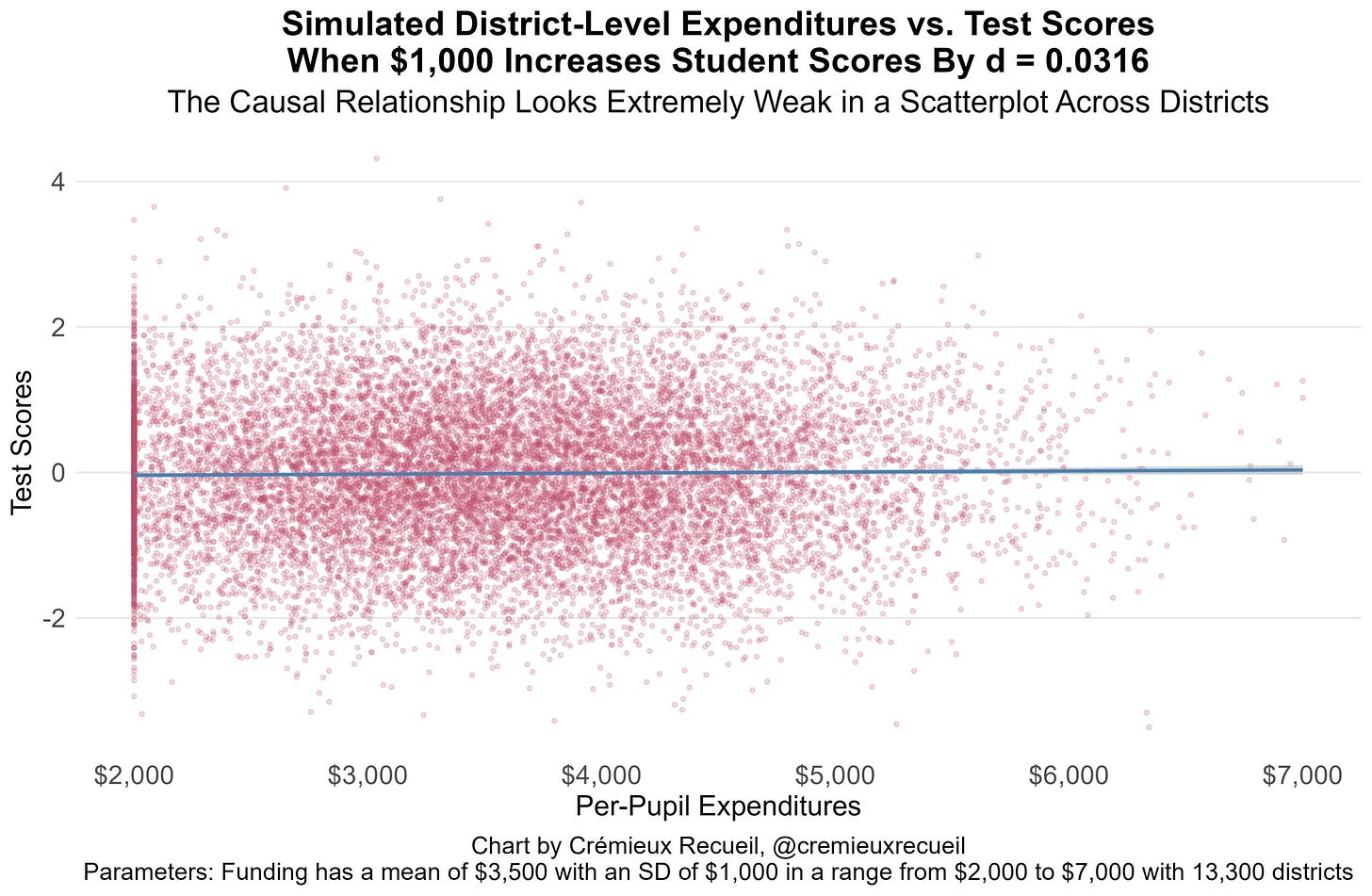 He posts a meta-analysis (Jackson & Mackevicius 2024) of educational spending and the estimated effects form the economic literature. He seemingly thinks this is good evidence, but looking at the forest plots we can see that it is quite terrible. The top plot (about test scores) shows that the average effect size is roughly 0, 0.03 to be specific. The more imprecise studies are more likely to produce positive results (more studies in the top than bottom). Even a tiny amount of bias in the included studies could cause the overall effect size to be slightly misestimated from 0 to 0.03 (or some other nearby value). The bottom plot is even worse, with almost all imprecise (smaller sample) studies in the top, typical of publication bias/p-hacking. In any case, if we accept the effect size claimed, Cremieux was kind enough to plot what this would look like: