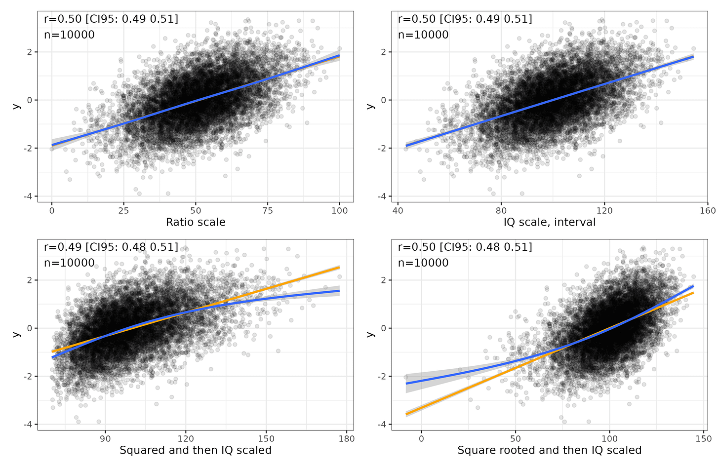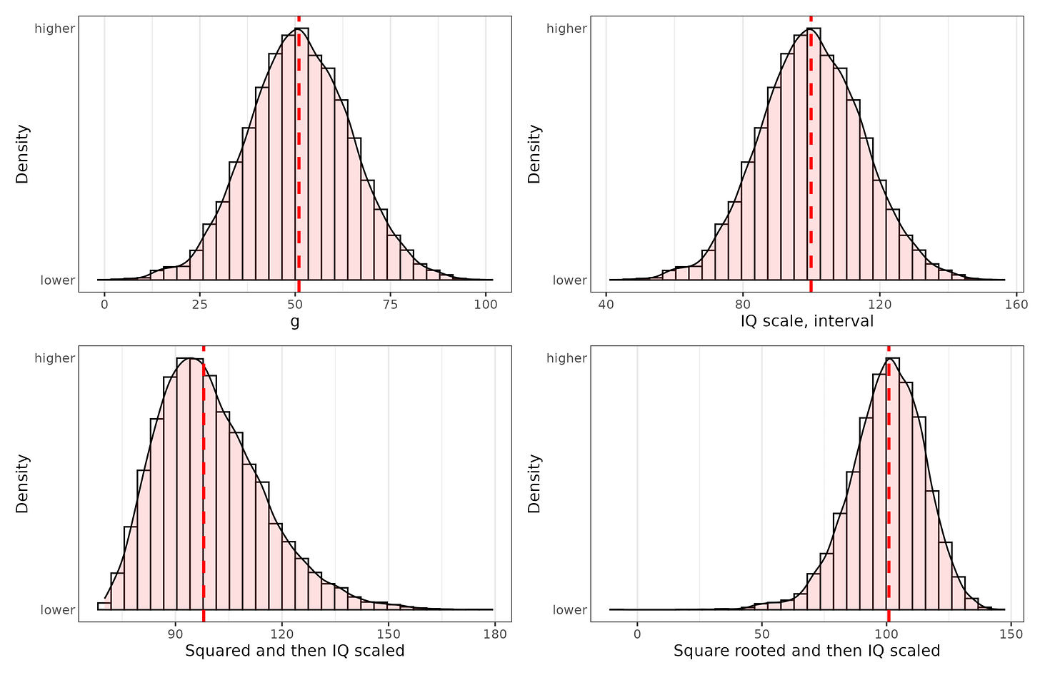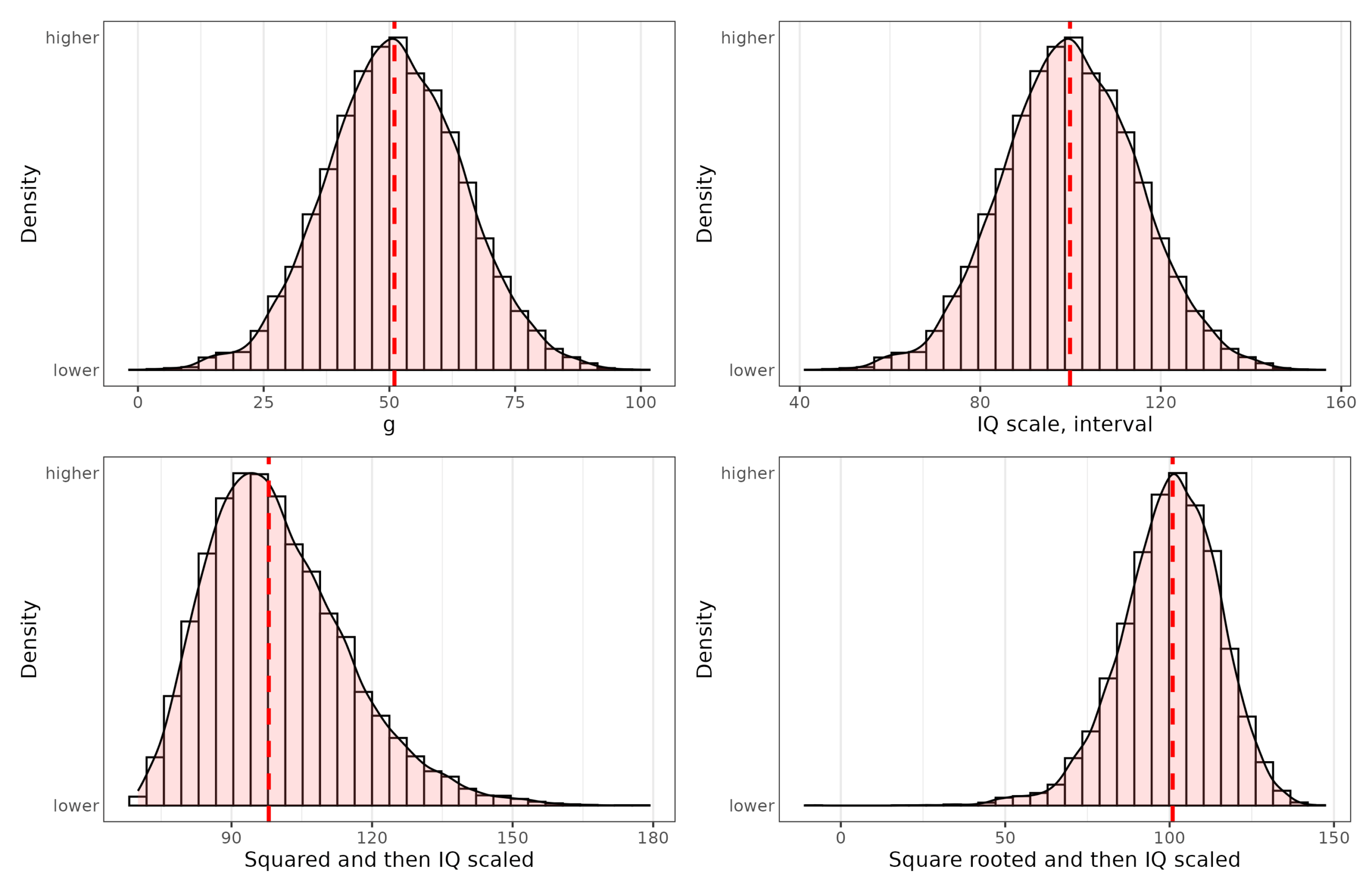 Top left plot is a hypothetical ratio scale of intelligence, with 0 being essentially brain dead (no intelligence), and 100 being arbitrarily the smartest person in 10,000 people. Ideally, one would measure brain speed or thinking ability in some proper unit, but no one knows what this unit might be. The best we have is analogies with computers, so flops and the like. Top right plot shows the standard IQ scale transformation of the ratio scale, which is what we hope we have. Bottom left shows a squared transformation followed by IQ scaling. Notice that if our measurement was actually this way, the relationship to external variables would be modified somewhat and turn a bit nonlinear. Bottom right shows a square root transformation, which also disturbs the relationship but in the opposite way. Here’s the distributions: