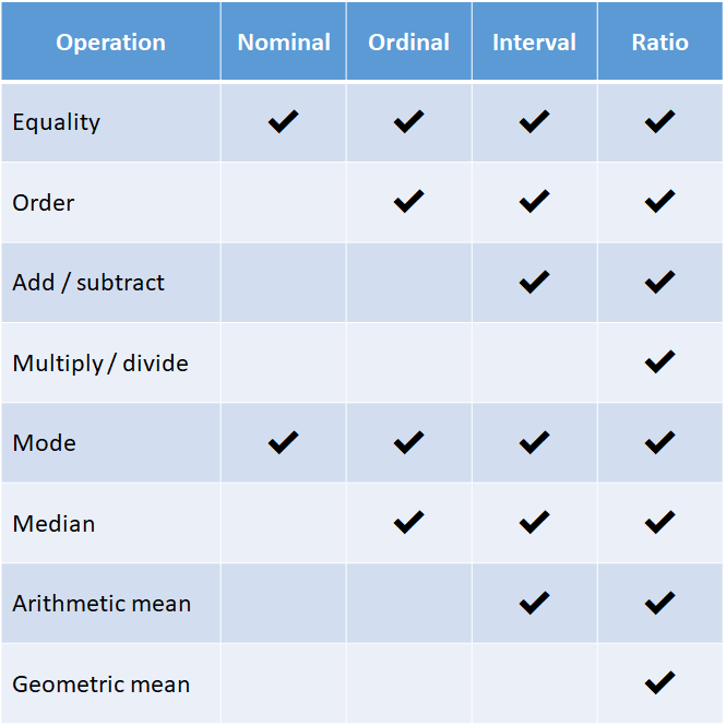 Each level of measurement allows certain mathematical operations to be used sensibly. If we just have arbitrary categories, we can still count them and thus find the mode (most common value). However, it makes no sense to calculate the average (the average sex is about 1.50 if we arbitrarily set male=1 female=2). Ordinal data improves on this, at least we can put things in order, even if the relative differences are unclear. Teenagers are older than children, but not necessarily by the same number of years as “young adults” are older than teenagers. Interval data has this problem solved such that measurements that are some units apart in value are actually the same distance in the construct of interest no matter where the difference is. The time between the year 1900 and 1920 is the same as that between 0 and 20. However, the 0 point is arbitrary and so it makes no sense to do multiplication/division, and thus percentage. Someone might say 20 C is twice as warm as 10 C, but would they say 10 C is -1 times as warm as -10 C? I hope not. Finally, (true) ratio scale measurement are the real deal where 0 on our measurement scale means there is no amount of whatever we are measuring: 0 m/s is not moving at all (in the reference system), 0 seconds is no time elapsed, and 0 Kelvin is no temperature. Using these scales we can correctly use ratios, and thus 20 K is twice as warm as 10 K, and 10 m/s is half as fast as 20 m/s.