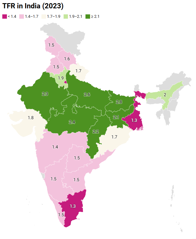 India reaches sub-replacement fertility at rapid pace. Also shows the same regional dysgenics as every other country I've looked at (though again, beware of TFRs as true measures of cohort fertility rates).