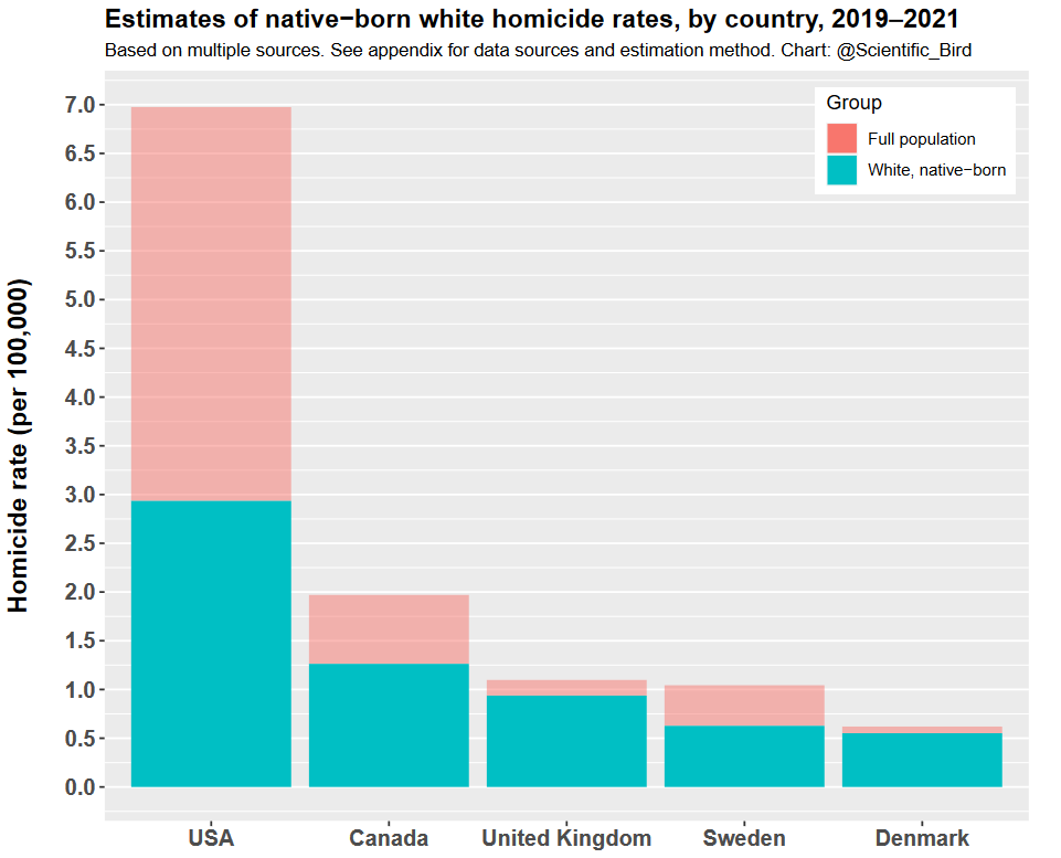 Semi-relatedly, US homicide rates are still markedly elevated compared to Europe countries even if you only compare the Whites/European ancestry people in both.