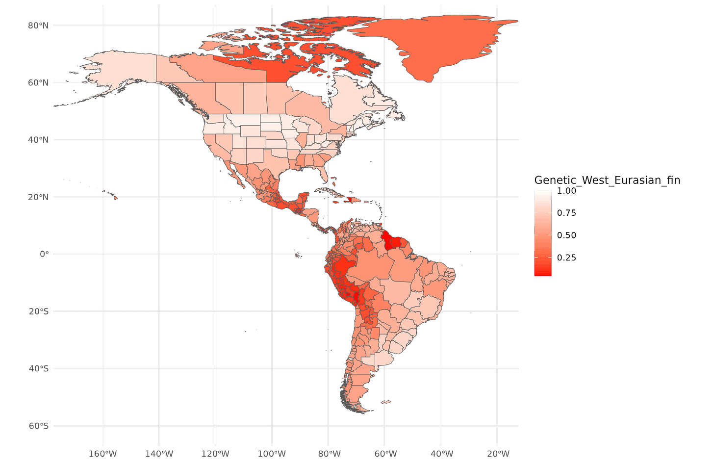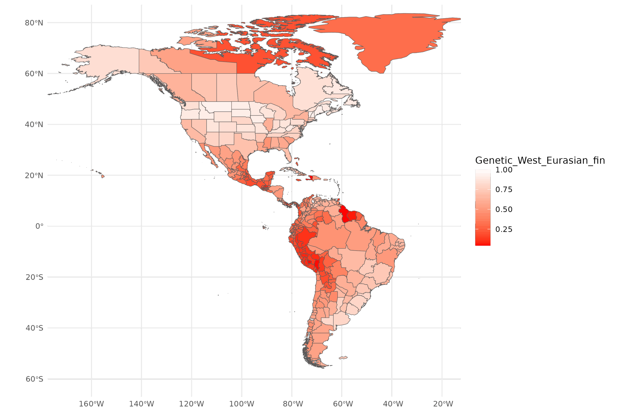 We are finishing up the next installment of the Admixture in the Americas, maybe for publication late this year or early next year. Back in 2016, we collected genetic ancestry data for all nations in the Americas (about 35) and many of their subnational divisions. We are repeating this study now with many more countries and better data. Sneak peak, European ('west Eurasian' to cover some edge cases) ancestry estimates for each unit we are studying: