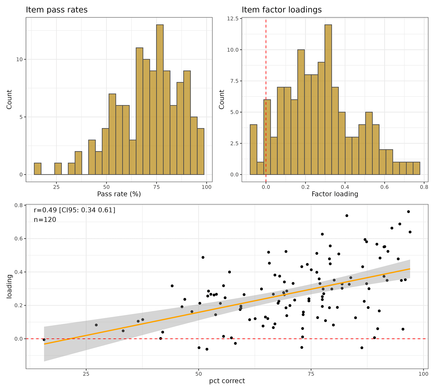 Since these are true or false questions, the guessing rate is just 50%, and any question with below 50% suggests users misinterpret the question, it is scored incorrectly, or there is some trick to it. Usually, when you make a scale/test, such questions are dropped. Similarly, the loadings distribution show that 9 questions have negative factor loadings and most have loadings below 0.30, a typically used cutoff for bad items. The items are not working very well in general as a measure of general knowledge. Still, because it has 120 items, it still achieves a reliability of 0.85, which is decent. Item pass rates and loadings are theoretically unrelated, but empirically may be related. We see a decent positive correlation, with a subset of items having below 50% pass rates and low loadings. These are the items with less than 40% pass rate: