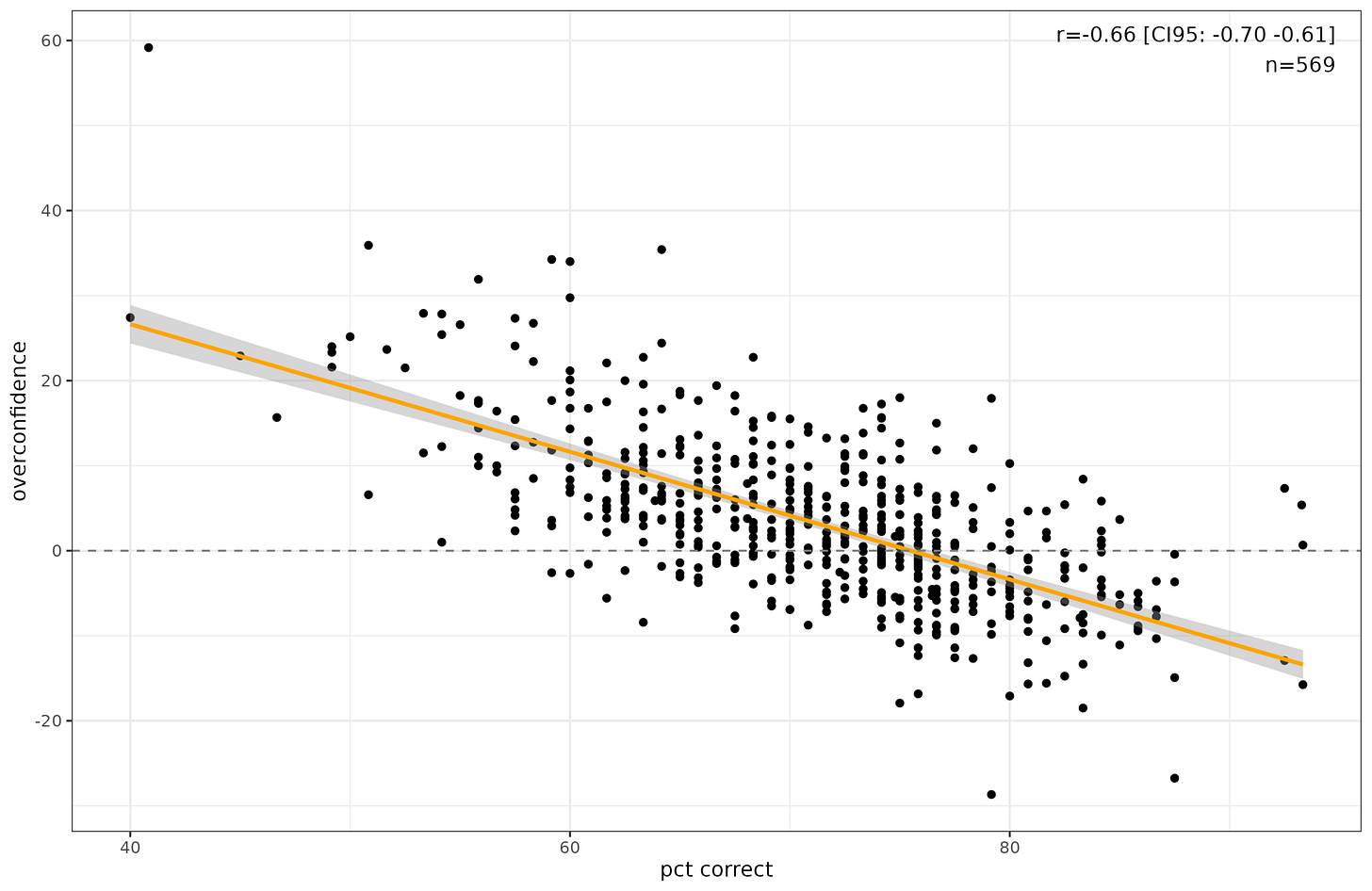 This is the aggregated item version of the usual Dunning-Kruger pattern. On average, when subjects said they were 100% confident, they were right about 87% of the time. On the other end, when they said 50%, they were right 55% of the time. By the size of the points you can also see that people rarely used the intermediate probabilities, using far too many 50%’s and 100%’s. Here’s the person-level version: