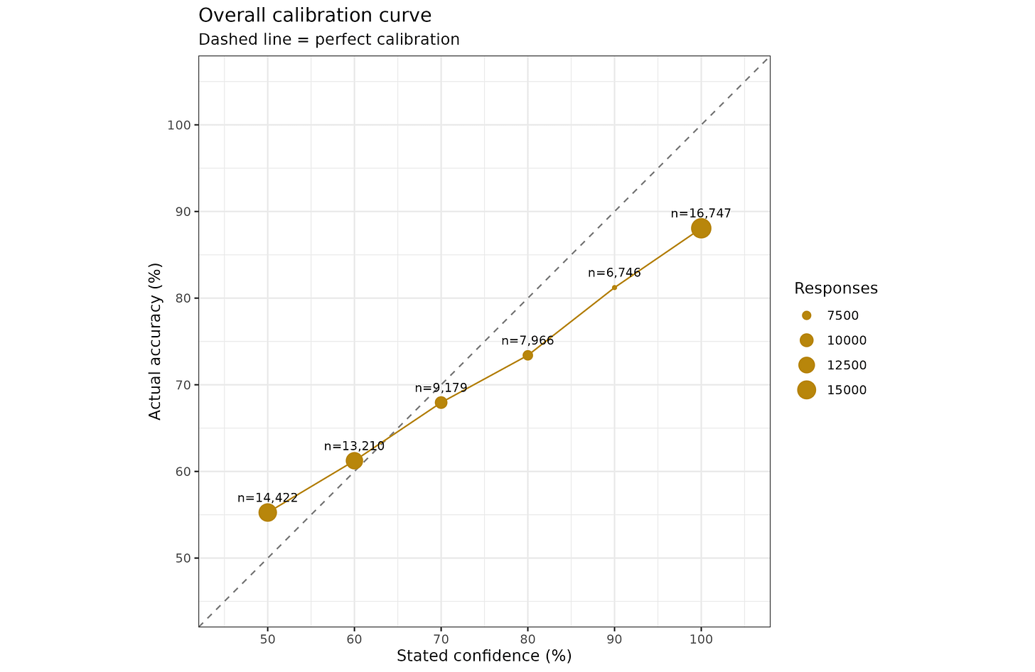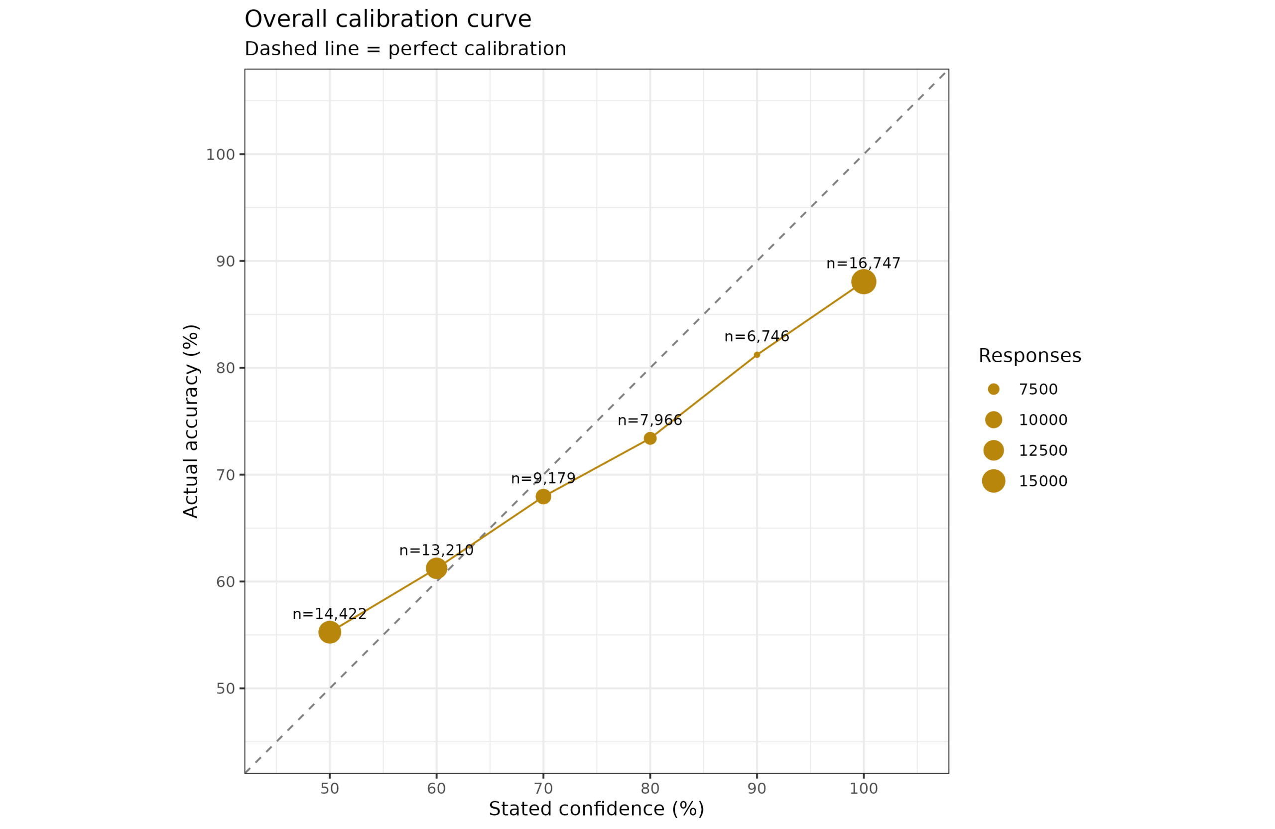 In terms of the overall level of calibration seen, we can group responses by confidence level and the actual correct %: