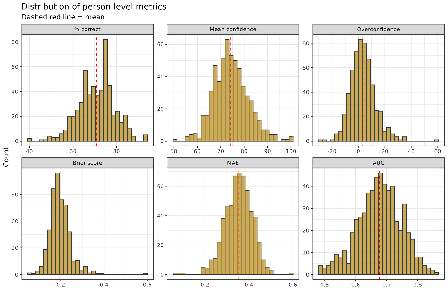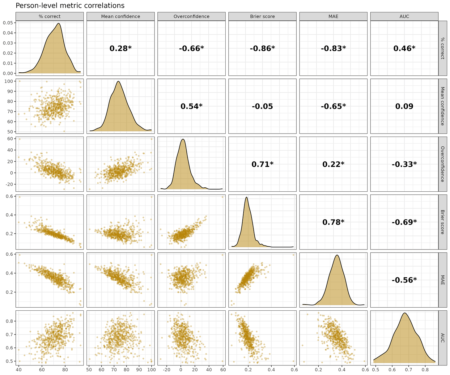 Most of them have at least decent correlations with each other but have different meanings. For instance, you could answer every question correctly with 50% confidence, and you will get 100% correct, but a bad score on the others. For interpretation, overconfidence is tricky because 0 is the best value, so in theory it should have nonlinear U shaped relationships to others, but it doesn’t. It is also mathematically impossible to be overconfident if you get everything correct, which necessitates a negative overconfidence score unless you answered 100% confidence to every question.