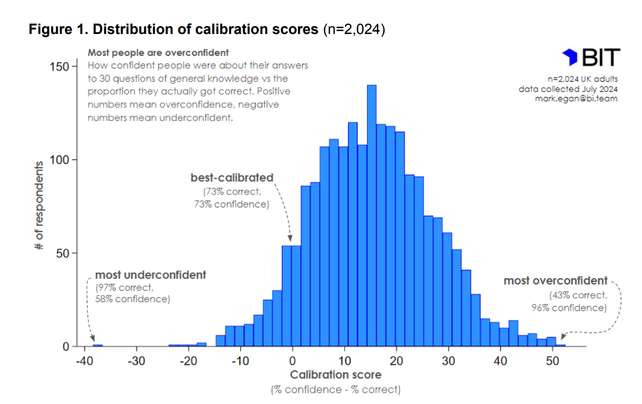 The people getting 75+ questions right were somewhat underconfident, and everybody else was overconfident. It is a common finding that people are in general bit overconfident. Here’s the distribution of overconfidence as seen in a study from the UK “nudge” unit: