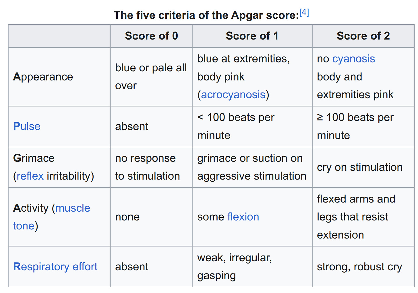 Also related to birth is the Apgar score, which is a simple composite of good neonatal functioning. We weren't provided with this score, but: