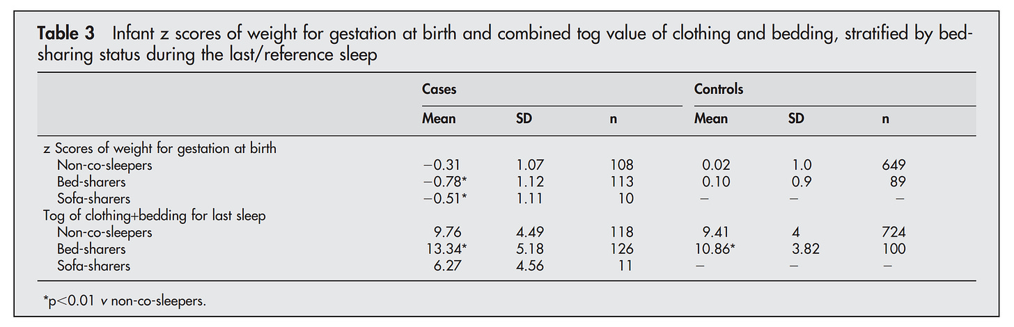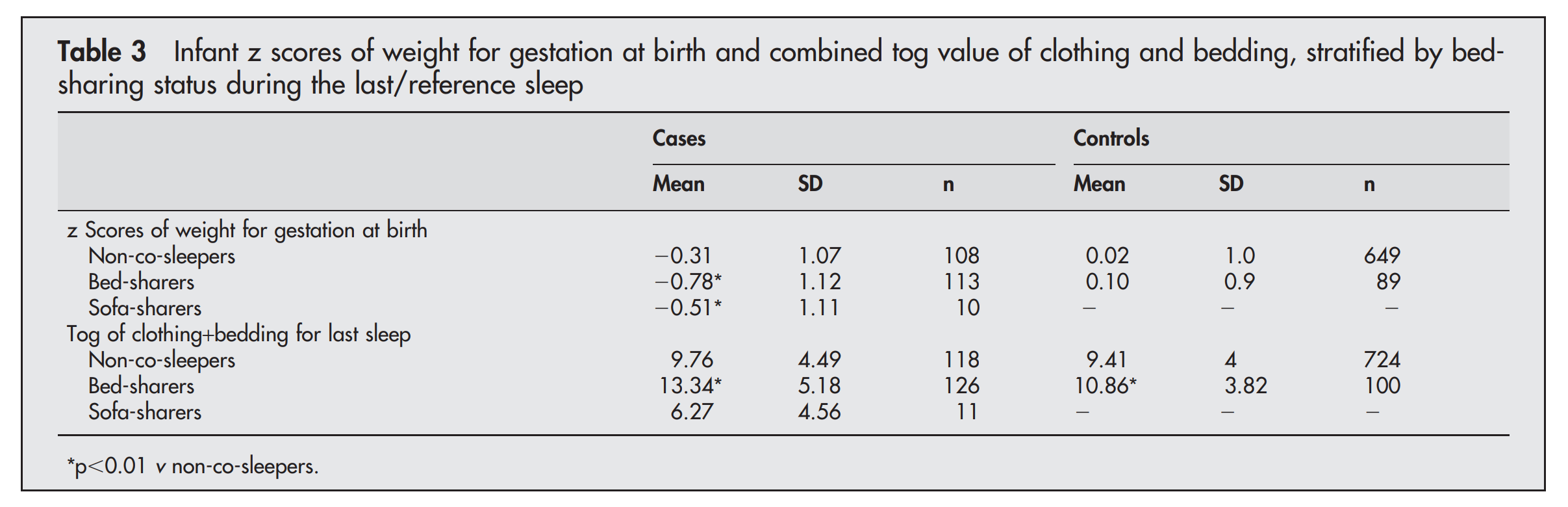 Conclusion: Risk factors for SIDS vary according to the infant’s sleeping environment. The increased risk associated with maternal smoking, high tog value of clothing and bedding, and low z scores of weight for gestation at birth is augmented further by bed-sharing. These factors should be taken into account when considering sleeping arrangements for young infants.