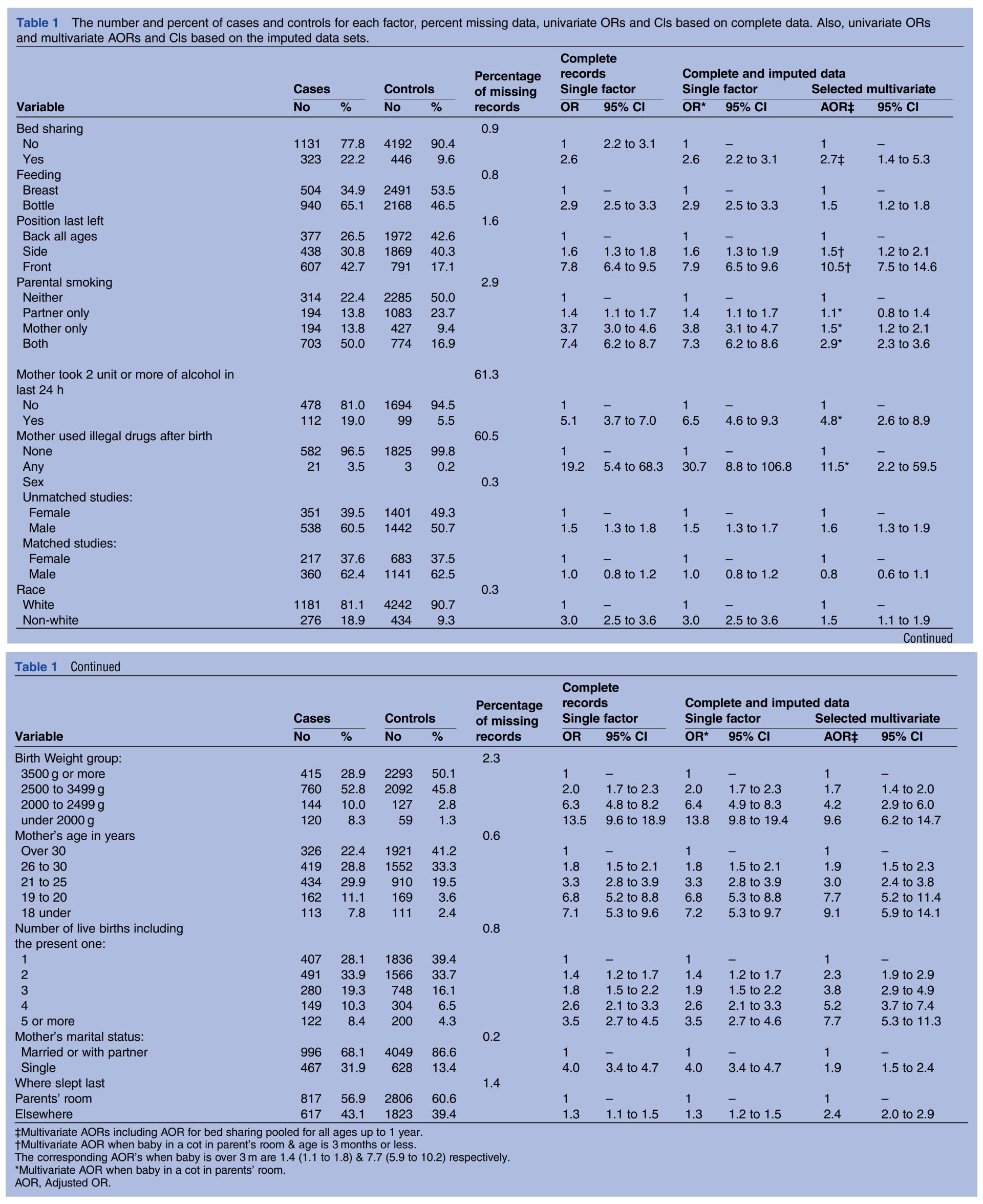Design Bed sharing was defined as sleeping with a baby in the parents’ bed; room sharing as baby sleeping in the parents’ room. Frequency of bed sharing during last sleep was compared between babies who died of SIDS and living control infants. Five large SIDS case–control datasets were combined. Missing data were imputed. Random effects logistic regression controlled for confounding factors.