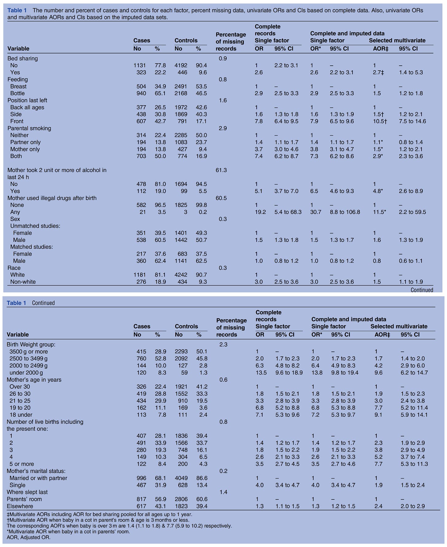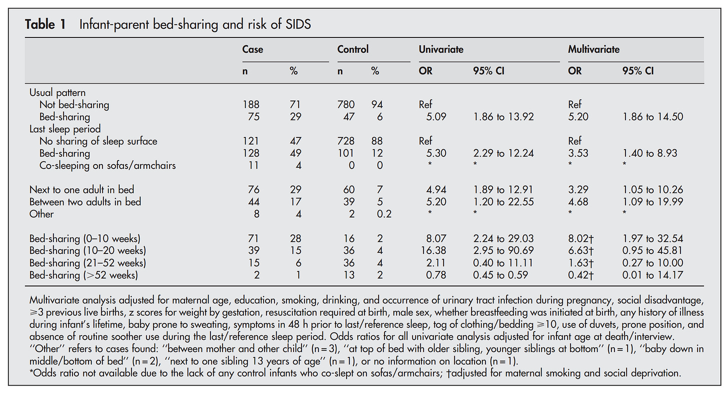Their multivariate analysis basically throws everything into the model that could plausibly be taken as a confounder (a cause of SIDS that correlates with bedsharing) and yet the signal remains (OR before 5.30 and after 3.53 controls). The problem is that bedsharing has all sorts of negative associations with parents and their behaviors. For instance, in this study from US Oregon by Lahr et al 2007: