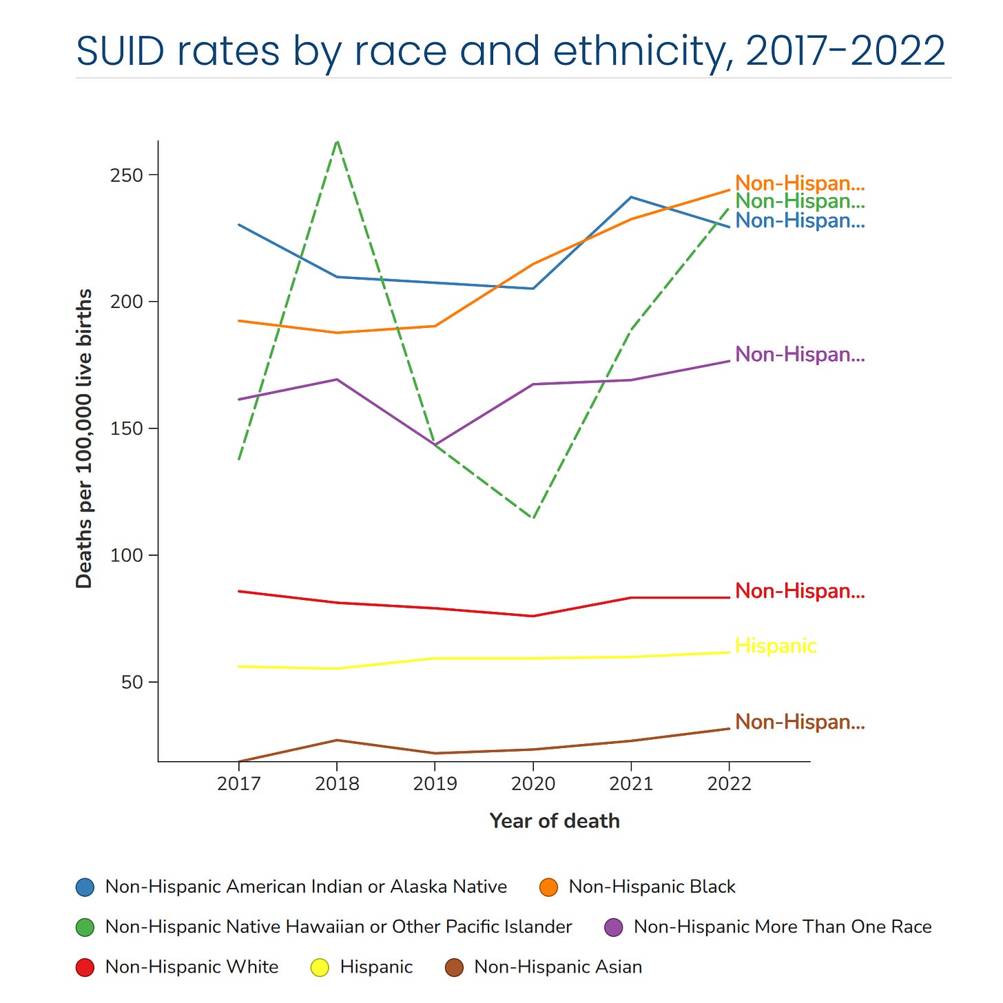A 2021 study of US rates of infanticide by Salihu et al found that Blacks had 1.23 rate of Whites and Hispanics 1.10 of Whites, while "Others" had a rate of 0.92 of Whites. Given the other violent crime rates, these numbers would appear to be too small (Black-White homicide ratio is usually around 8x, but a large number of unsolved cases means this relative rate is probably higher). This could mean that some cases of infanticide are misclassified as SIDS for these groups.