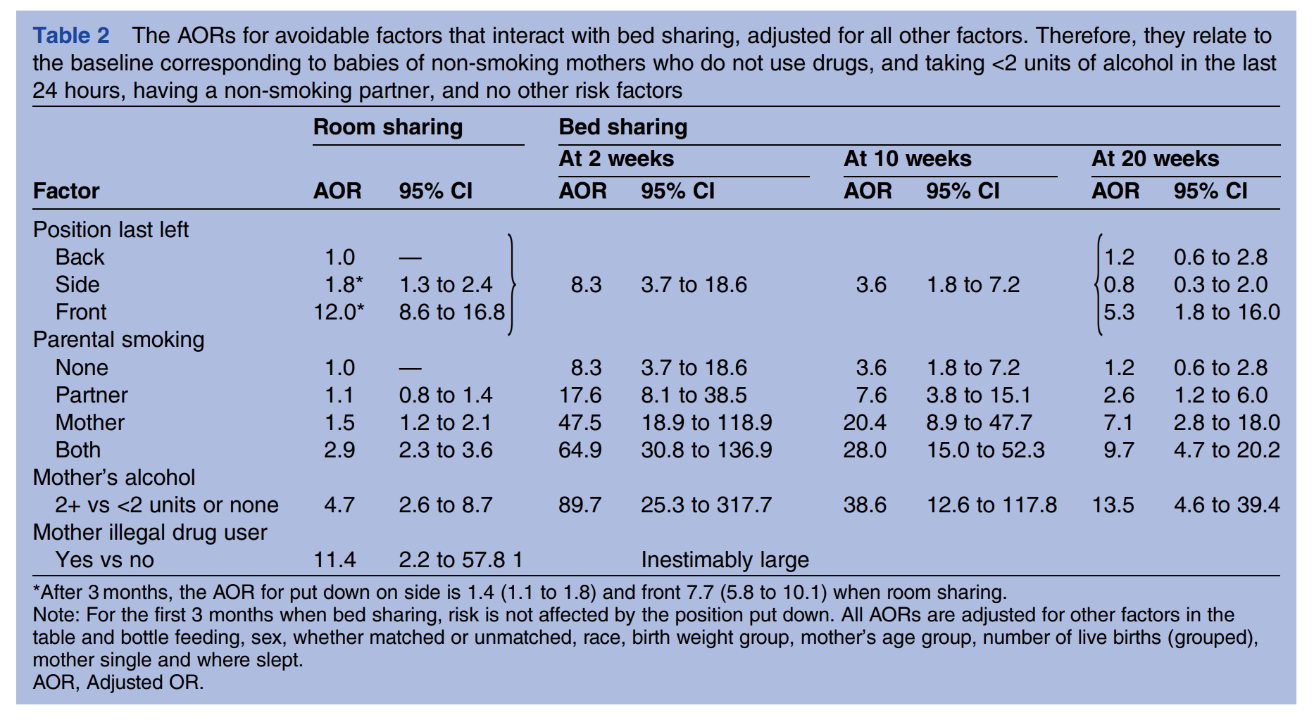 Results In the combined dataset, 22.2% of cases and 9.6% of controls were bed sharing, adjusted OR (AOR) for all ages 2.7; 95% CI (1.4 to 5.3). Bed sharing risk decreased with increasing infant age. When neither parent smoked, and the baby was less than 3 months, breastfed and had no other risk factors, the AOR for bed sharing versus room sharing was 5.1 (2.3 to 11.4) and estimated absolute risk for these room sharing infants was very low (0.08 (0.05 to 0.14)/1000 live-births). This increased to 0.23 (0.11 to 0.43)/1000 when bed sharing. Smoking and alcohol use greatly increased bed sharing risk.
