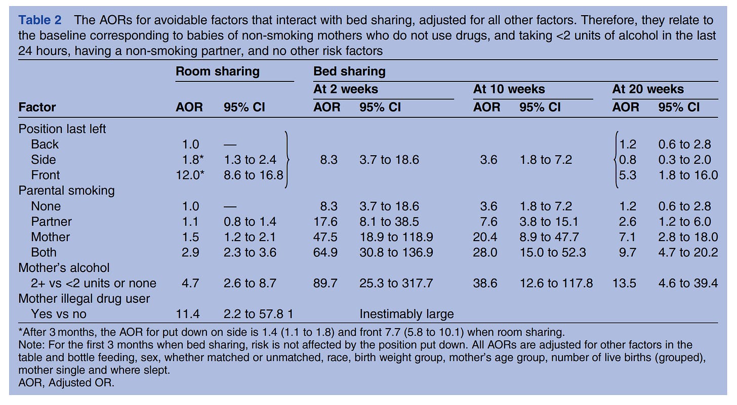 The adjusted ORs are in comparison with 1 for the reference class (non-smoking, non-drinking, non-drug mothers). The authors don't actually report the p values of the interactions as far as I can tell, and interactions in logistic models can be hard to differentiate from combined effects due to the log-odds scaling. In any case, we see that age of the baby has a large effect (not reported in table 1 for some reason), bedsharing appears to be especially dangerous in the first few weeks, which is problematic because this where it is the most common and the baby demands it the most. It's especially bad if the mother was drinking (90x OR of SIDS), and "inestimably large" if the mother is also an illegal drug user.
