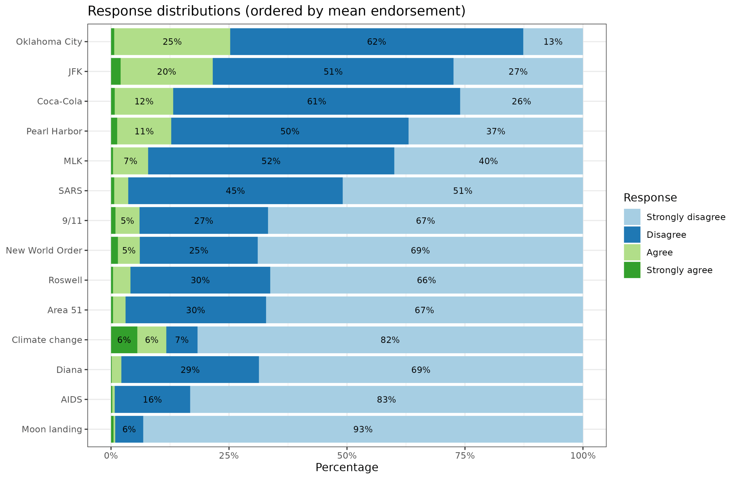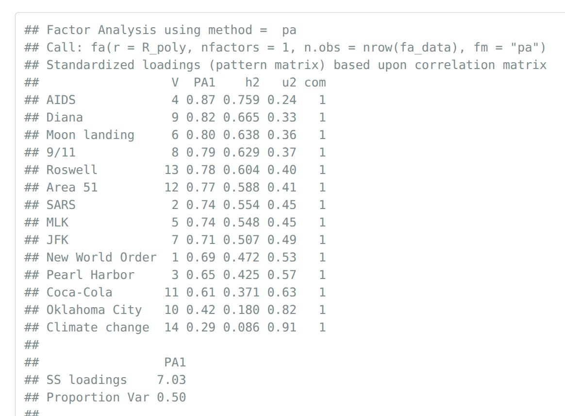 Note the general factor is ~50% of variance, but climate change only has a loading of 0.29, the weakest by far in their study. If we instead use a 2 factor solution, we get results that depend on method: 1) one method makes factor 2 = aliens (area51 + Roswell), which can also be seen from the correlation matrix (r = 0.90), 2) another method makes factor 2 = climate change (the only variable with salient loading). Factors with just a single variable are pointless. This is just telling us again that this variable correlates relatively poorly with the others. Anyway, regarding the title of the original paper “NASA Faked the Moon Landing—Therefore, (Climate) Science Is a Hoax: An Anatomy of the Motivated Rejection of Science” is fairly derpy. Looking at the correlation matrix, there is no particular relationship between climate science conspiracy theory belief and moon landing one, it has a slightly stronger relationship to AIDS conspiracy belief. But given the relatively few people who endorsed some of these beliefs, these correlations will not differ more than expected by chance.