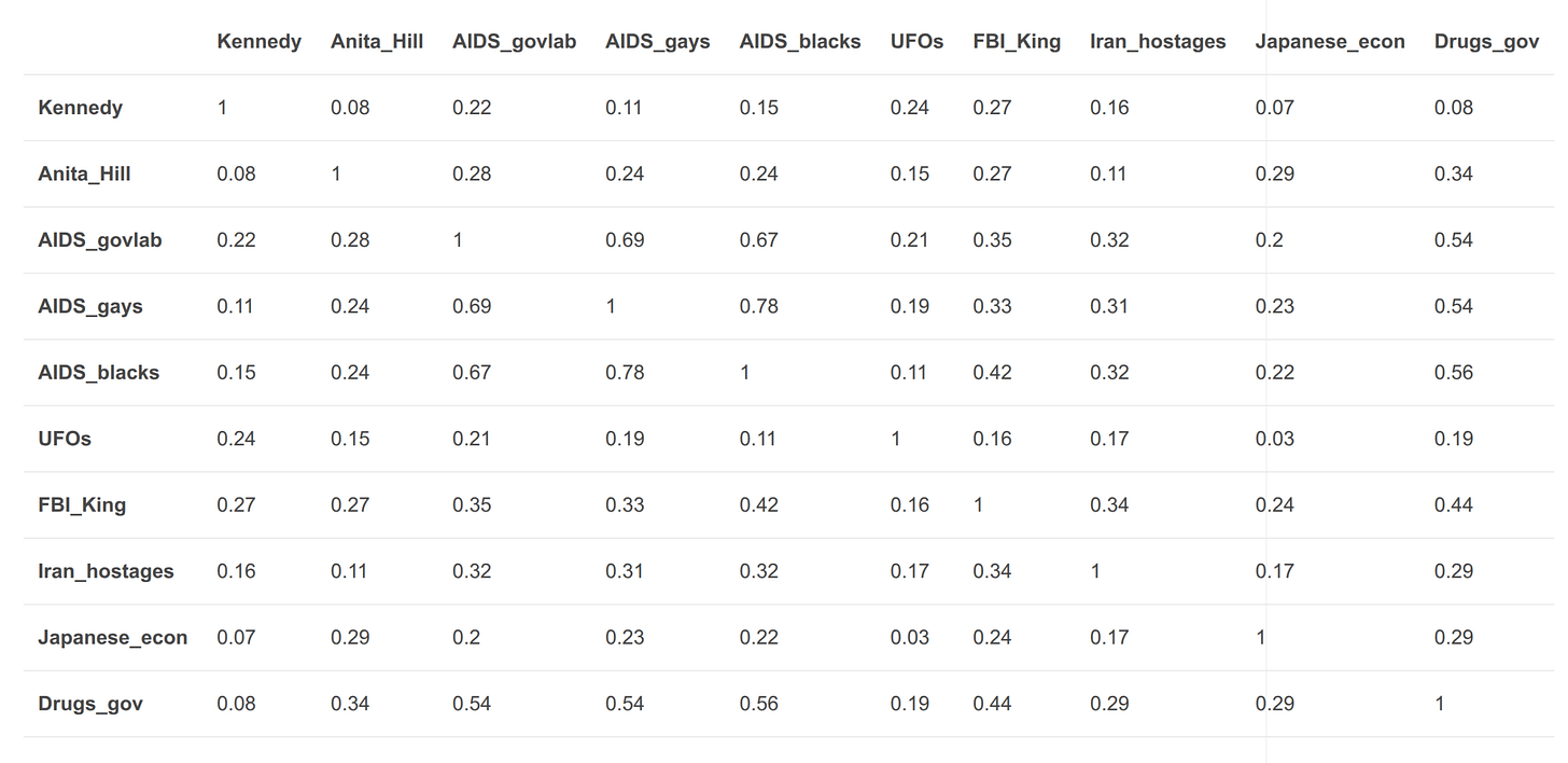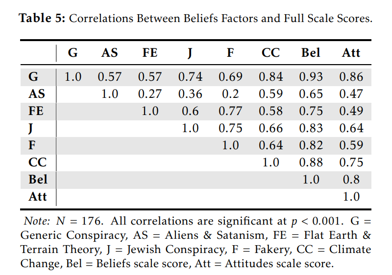 There are many other studies that have looked at many conspiracy, paranormal, and other unconventional beliefs. Many years ago (2015) I posted one of these, that produced these correlations: