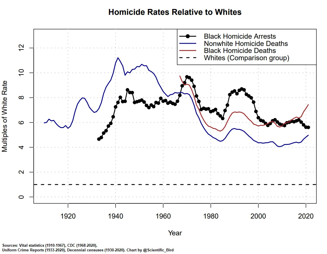 So everybody knows that race predicts crime, that is, members of some races are more likely to be criminals than others. These rank-orders are mostly not but entirely consistent across time and place, which I reviewed previously. In the USA, Blacks (~80% African ancestry, ~20% European) have by far the highest crime rates with a homicide rate about 6-10x the White one, depending on time: