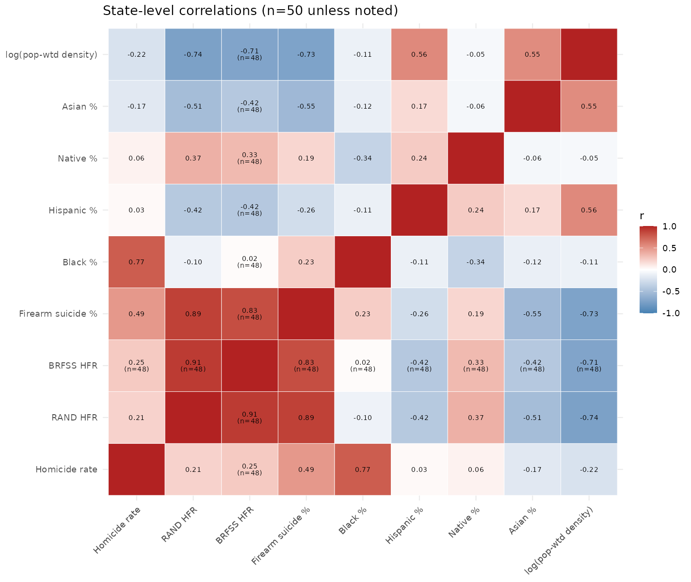 RAND is the RAND institution’s estimates of % of households with firearms, BRFSS is the one based on the large surveys. They correlate at 0.91. Firearms suicide % is the other method, which correlates at about 0.85 with the others. Pretty good.