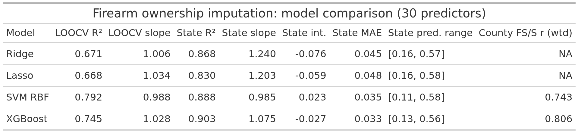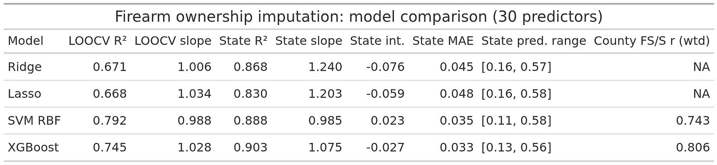 The task is extra difficult here because we must predict potentially out of range from the training data. The training data does not have any data for rural counties with small populations and high gun ownership rates, but we must somehow predict these correctly. We don’t care about model interpretability here, just predictive validity, so we can use fancy machine learning algorithms that can capture nonlinear and interaction effects. I tried a few different models from the simplest (ridge regression) to the more flexible (xgboost, SVMs). Still, we have to recall that we only have 118 large counties to train on (MMSAs), so we have to be rigorous about overfitting issues.