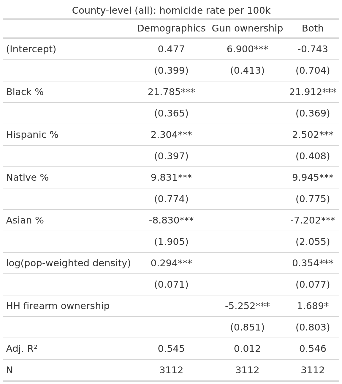 Here gun ownership predicts in both models, but it’s a poor predictor (about 2% variance), and yet it retain p < 1% with the demographic controls. And finally for all the counties including the imputed ones: