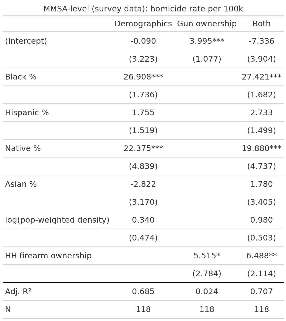 Now it predicts... negatively alone, presumably because of high estimated ownership% in White rural countries with low homicide rates, and it predicts slightly positively net of demographics (p < 5%). This decline in slope is possibly related to our imputations being dodgy for these units, but note that Black% is also smaller. This relates to sampling errors in the outcome variable as well I think, which can also be seen in the R2 being lower.