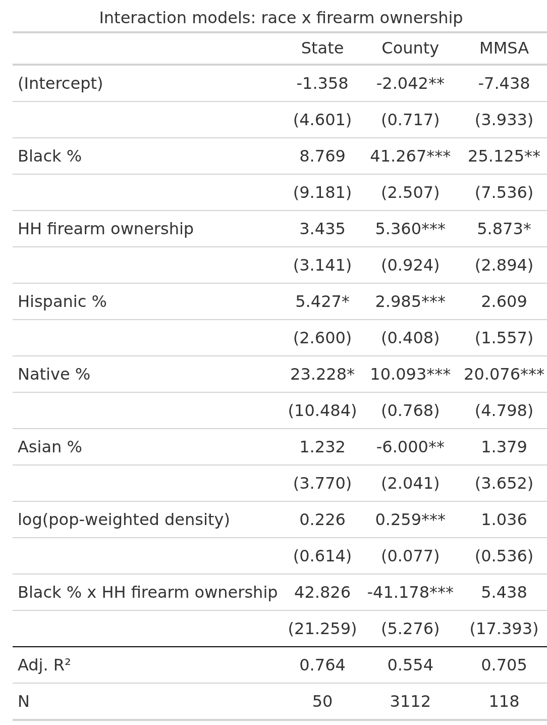 There’s nothing for the datasets where we have high quality estimates, but there’s a strong negative interaction for the imputed data. I am not sure what to make of this. Gun ownership protects against Black homicides? Dubious. The issue is that the small-n models cannot estimate these values precisely (SEs about 20), which is also why Black% is unstable (non-sig for states). We didn’t get much more wise with this interaction test analysis since the 2 datasets with reliable data are underpowered, and the one with sufficient power relies on questionable imputations.