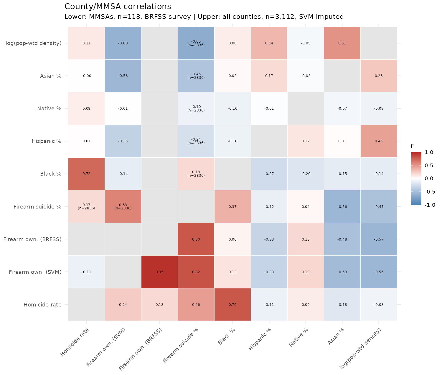 Bottom half has the full dataset, upper only the large counties used for training. There’s no BRFSS data for counties, only the aggregated city data, so those cells are empty. In the all data part, we see that the correlations for imputed values and the firearm suicide % are similar, except for the correlation with Black% which changes sign. May be a problem. We don’t have any ground truth for the counties, so we just kinda have to have faith that the imputations generalize to the small-n counties based on the city data. We know they generalize to the states, even the ones that weren’t used for training. Overall, though, it does seem like more guns means more homicides in general, net of demographics and our county-level analyses back this up, just not entirely convincingly so.