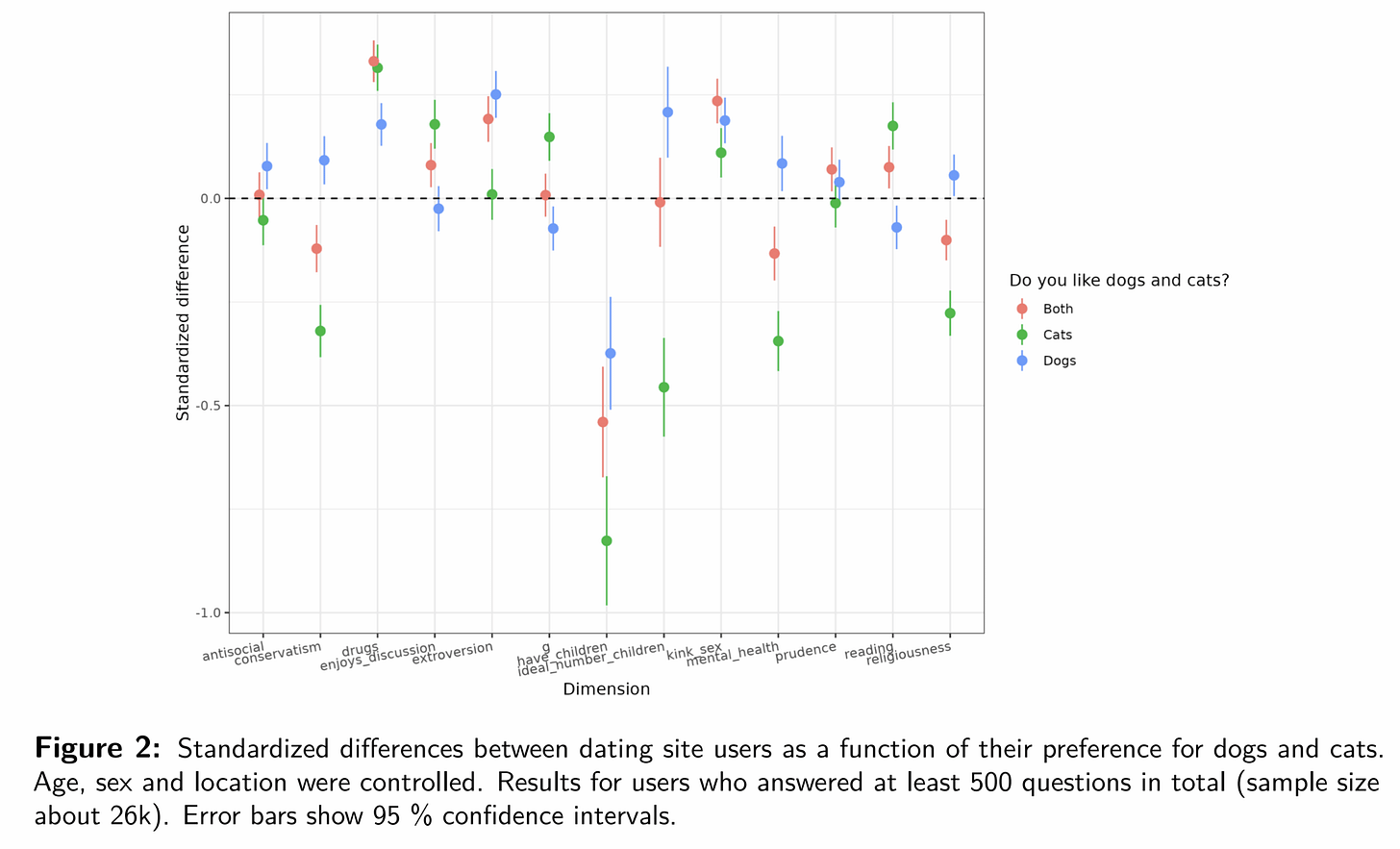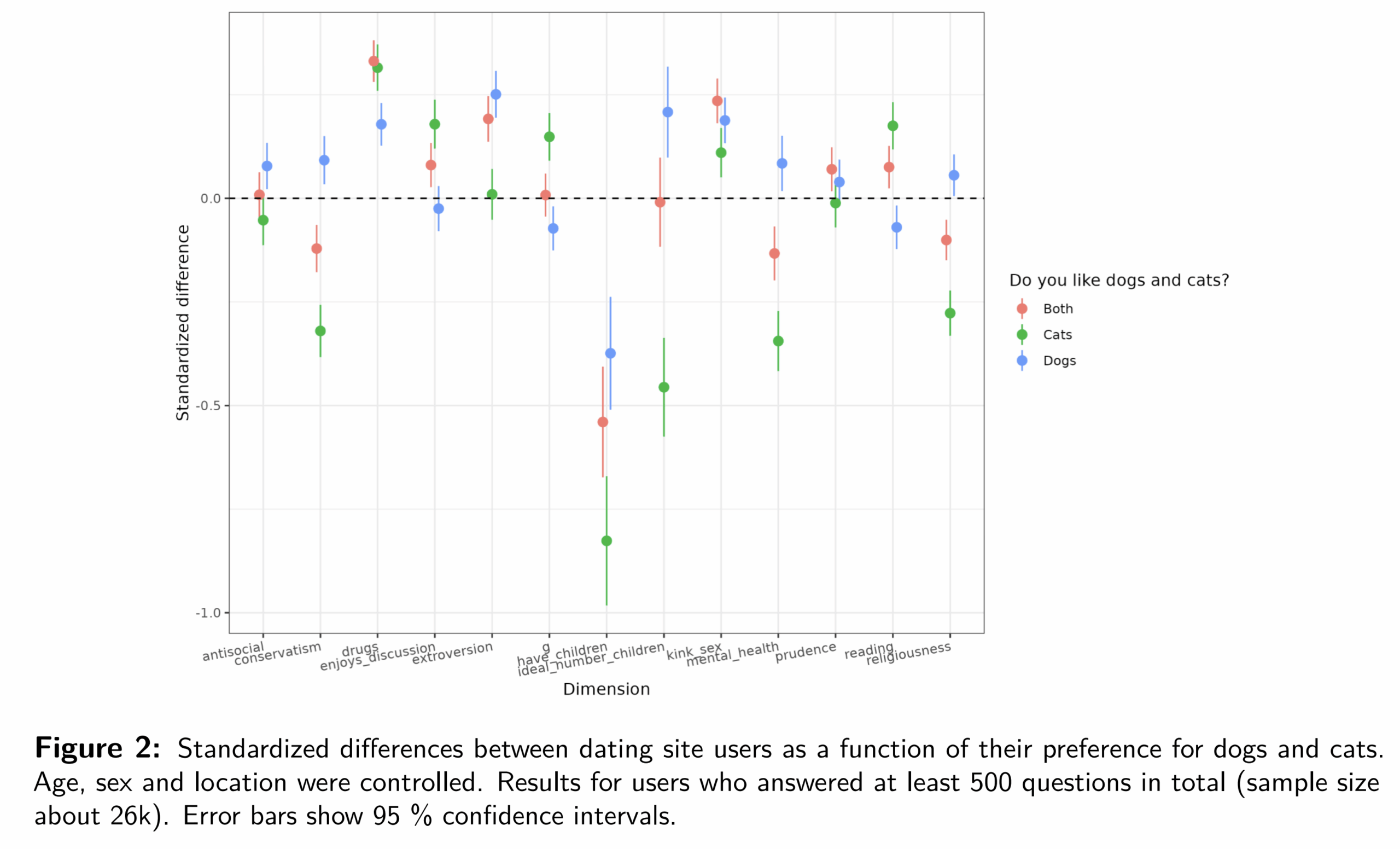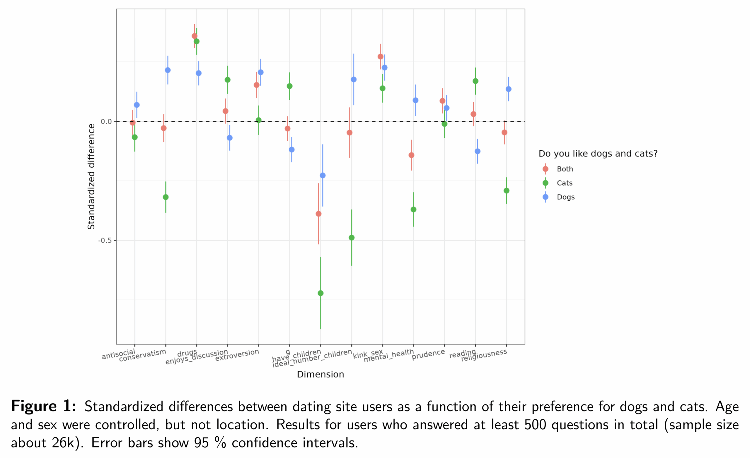 The comparison group is people who don't like either dogs or cats (which is the 0 line). This choice is arbitrary (probably grand mean coding could make a more intuitive plot). In any case, these results are controlled for age and sex, but nothing else, including not for where people live. Of the larger differences, we see familiar (get it?) patterns:
