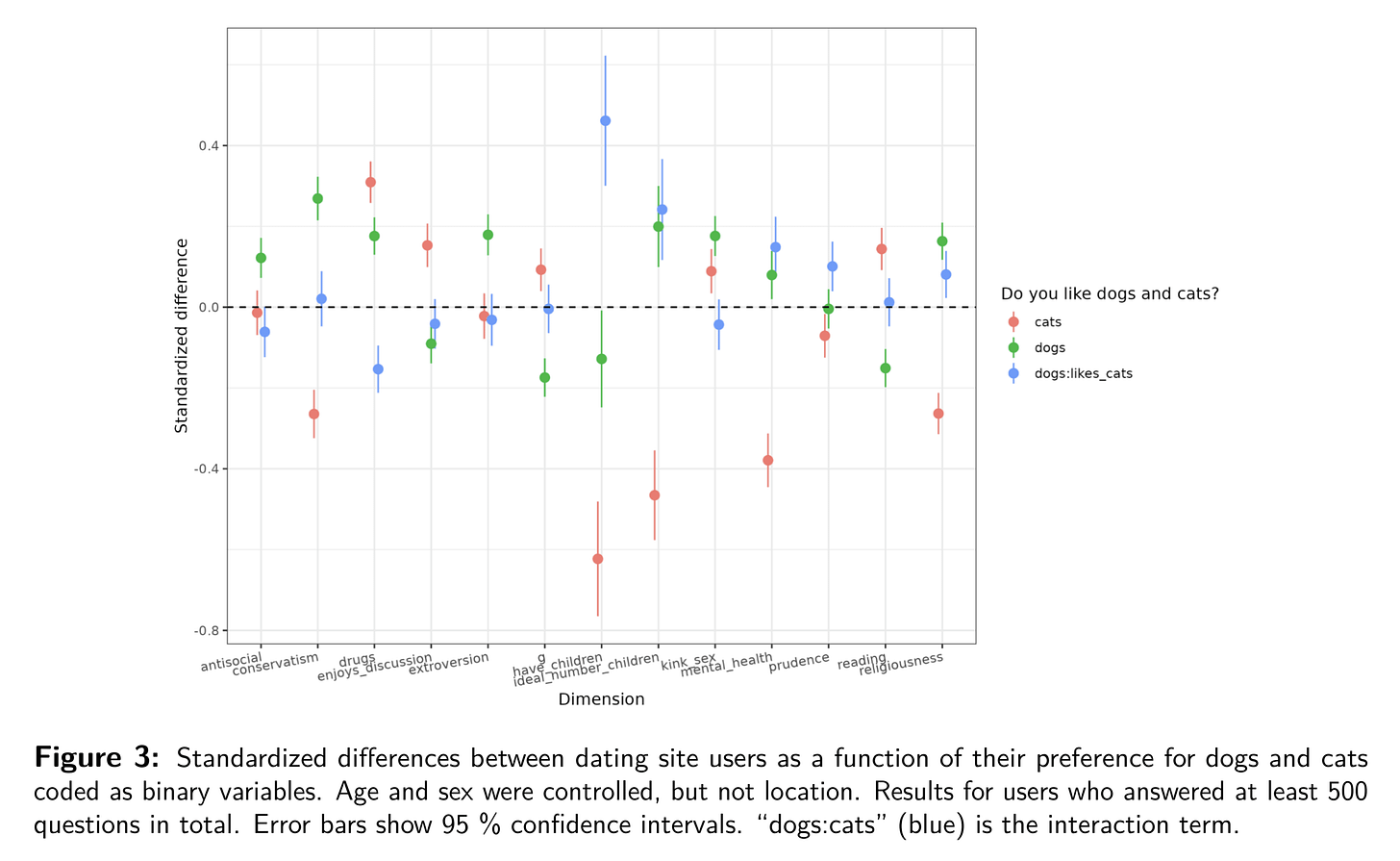 In the plot, the blue dots are the interactions. When it differs from 0, it means that liking both pet types is not the same as just adding up the effect of liking either taken in isolation. Most of these blue dots are near 0, though 2 of them are above 0.2 d. These both relate to fertility. So perhaps the same kind of people who like children also tend to like all animals in general, or at least, the typical pets.