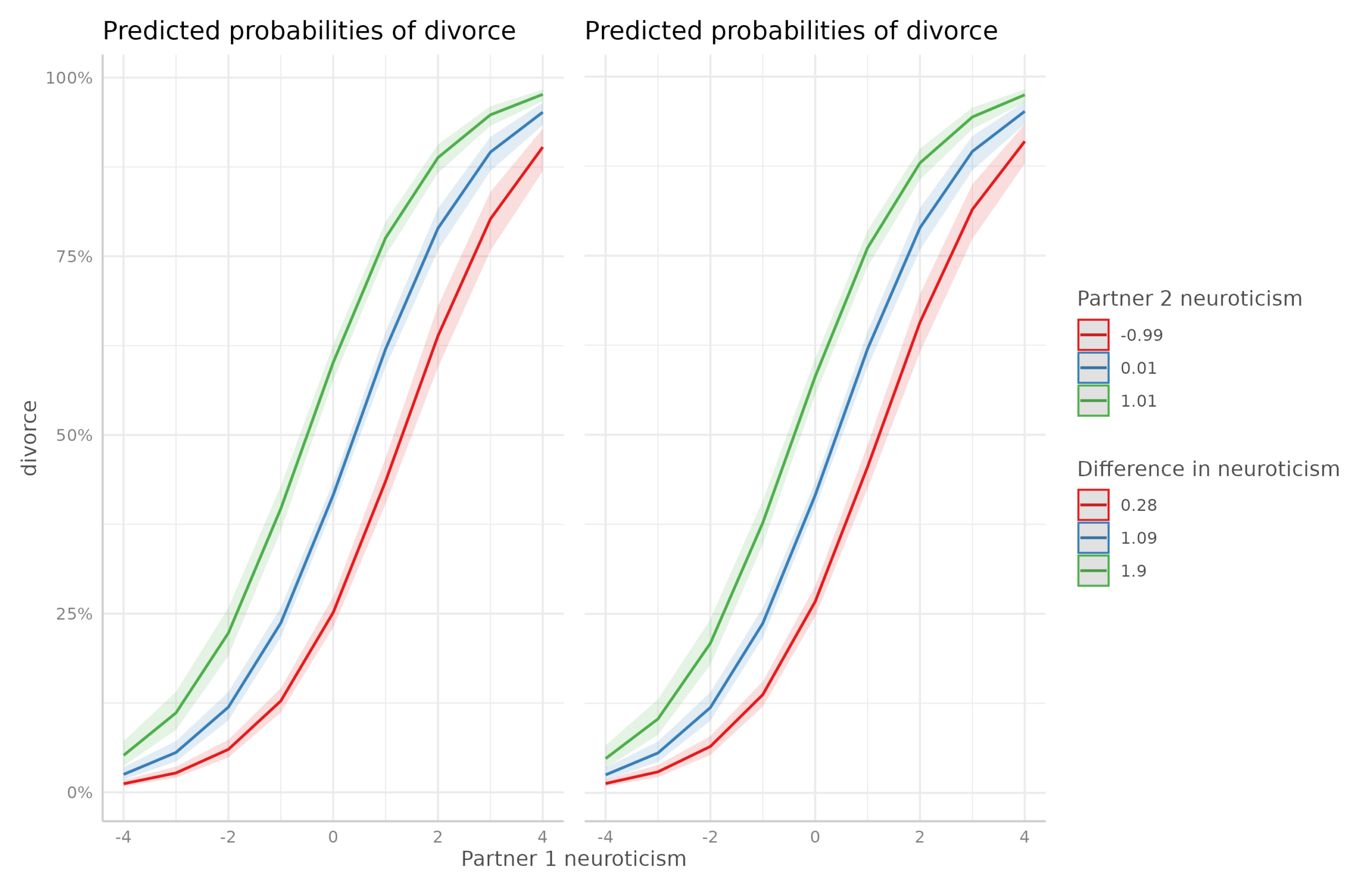 The rightmost plot shows the main effects only. In this case, the effect of neuroticism is just how much of it you have in a relationship, it doesn’t matter how it is distributed. Because of this, there are lines of equivalent risk going from the top left to bottom right, since e.g. +1 + -1 = 0, and 0 + 0 = 0. In the leftmost plot, we see the effect of the assortment giving rise to the lines horizontally and vertically. The lowest risk of divorce is found for couples that are perfectly matched (on the central line), at any given level of average neuroticism within the couple. These results are purely hypothetical to give us an understanding of how the statistics would work out. Probably the strength of the dissimilarity effect is not as large as I have assumed here, but I wanted it to be easy to discern on a plot.