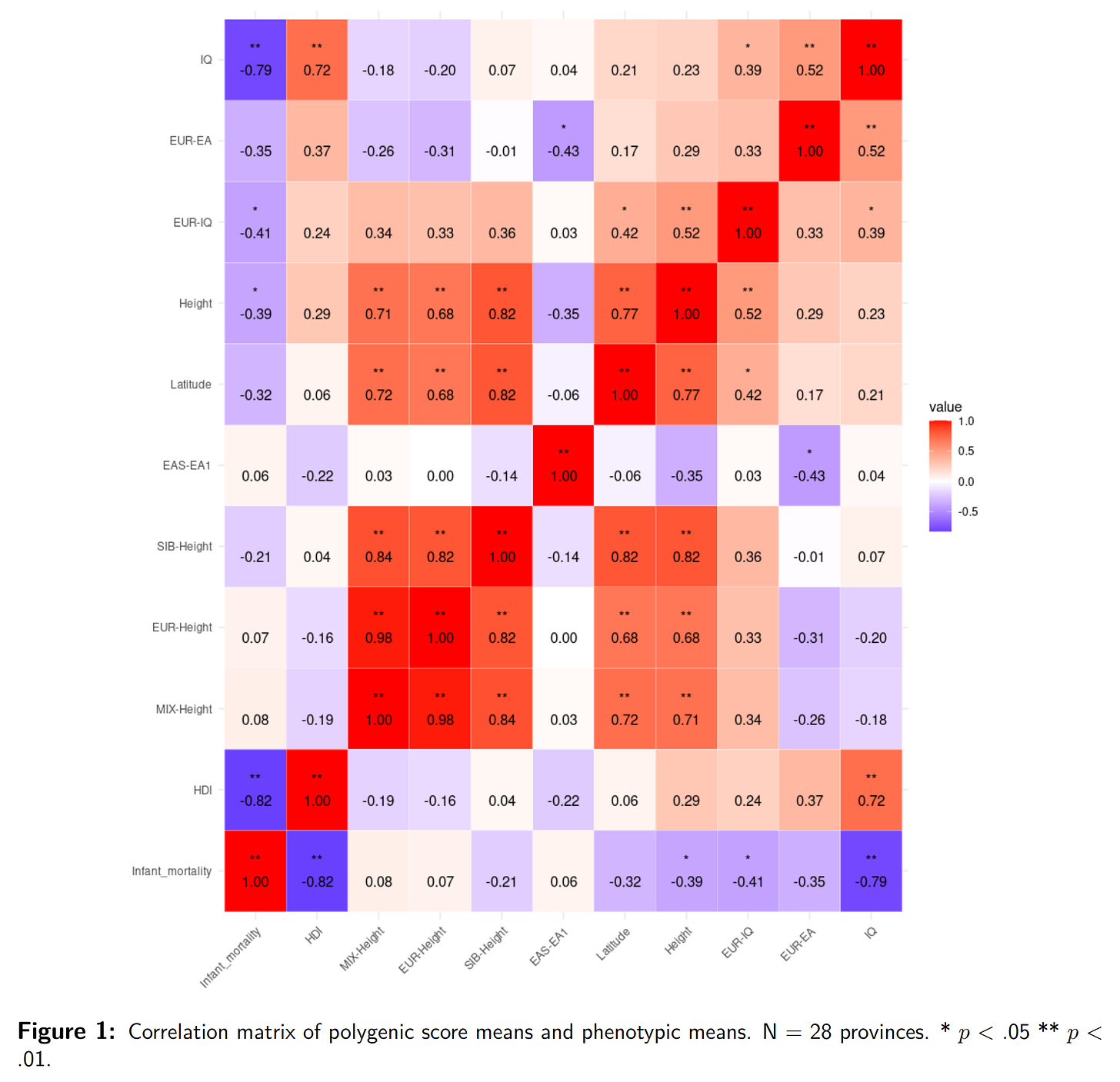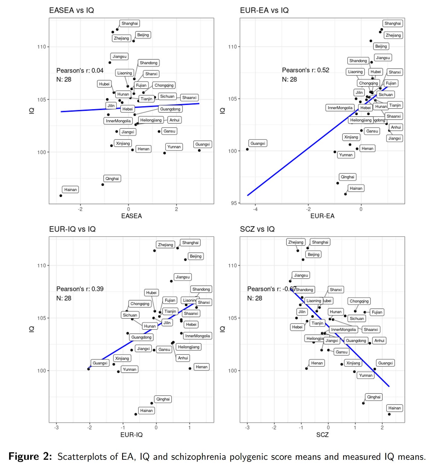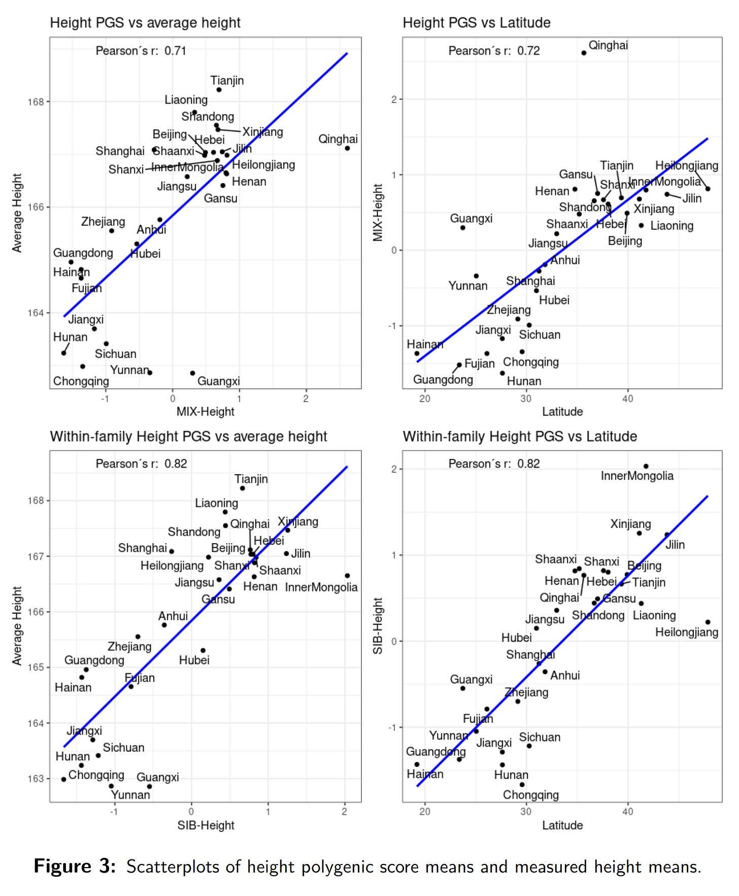 From the perspective of someone like Sasha Gusev who seems to think everything is a coincidence and nothing works, the findings are mysterious. Polygenic scores from models trained on mixed ancestry groups living in the West, or on Europeans living the West, or even on European sibling pairs, all show substantial correlations with actual height differences across provinces of China where there are no Europeans. Likewise, the real intelligence differences across Chinese provinces correlate with European-trained polygenic scores. Why do the scores keep working? Why are the means usually in the right order? He won't say, can't say.