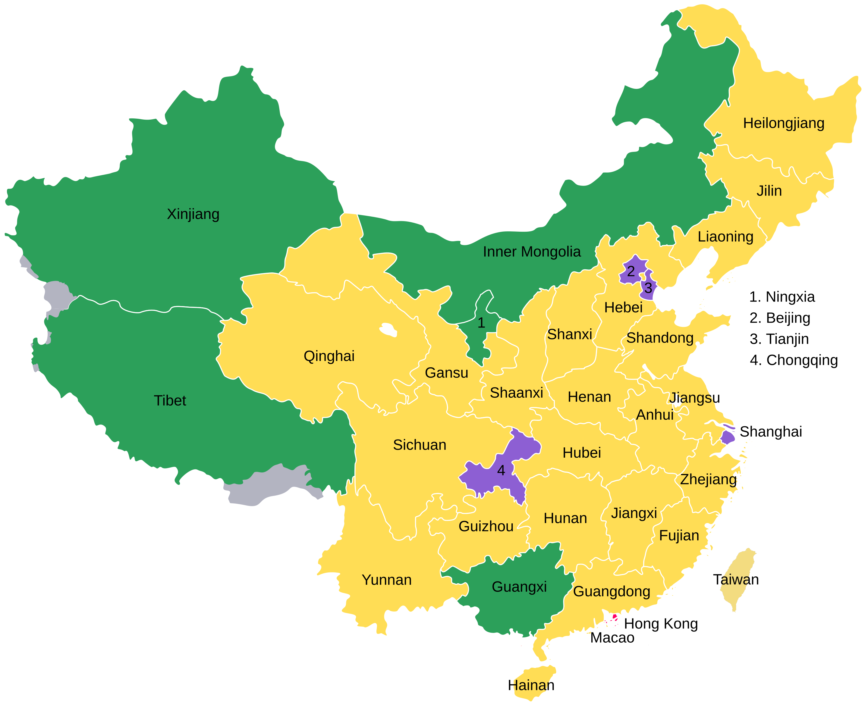 Let's talk China. China is a massive country with a complex legal structure. However, at a first approximation there are 33 province-level divisions, which look like this: