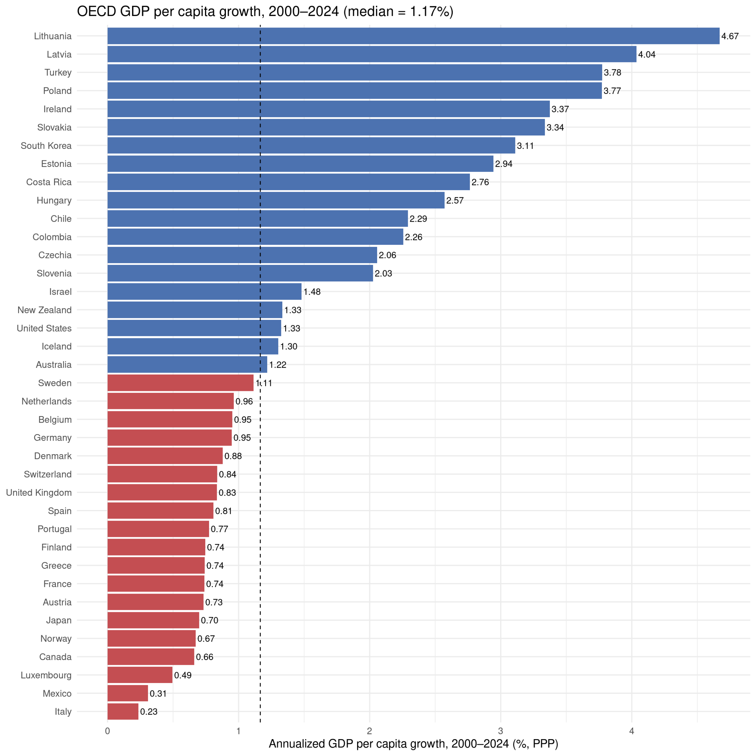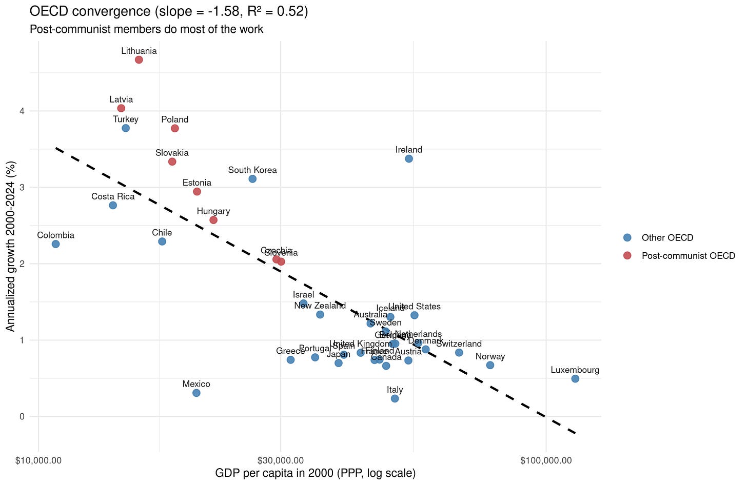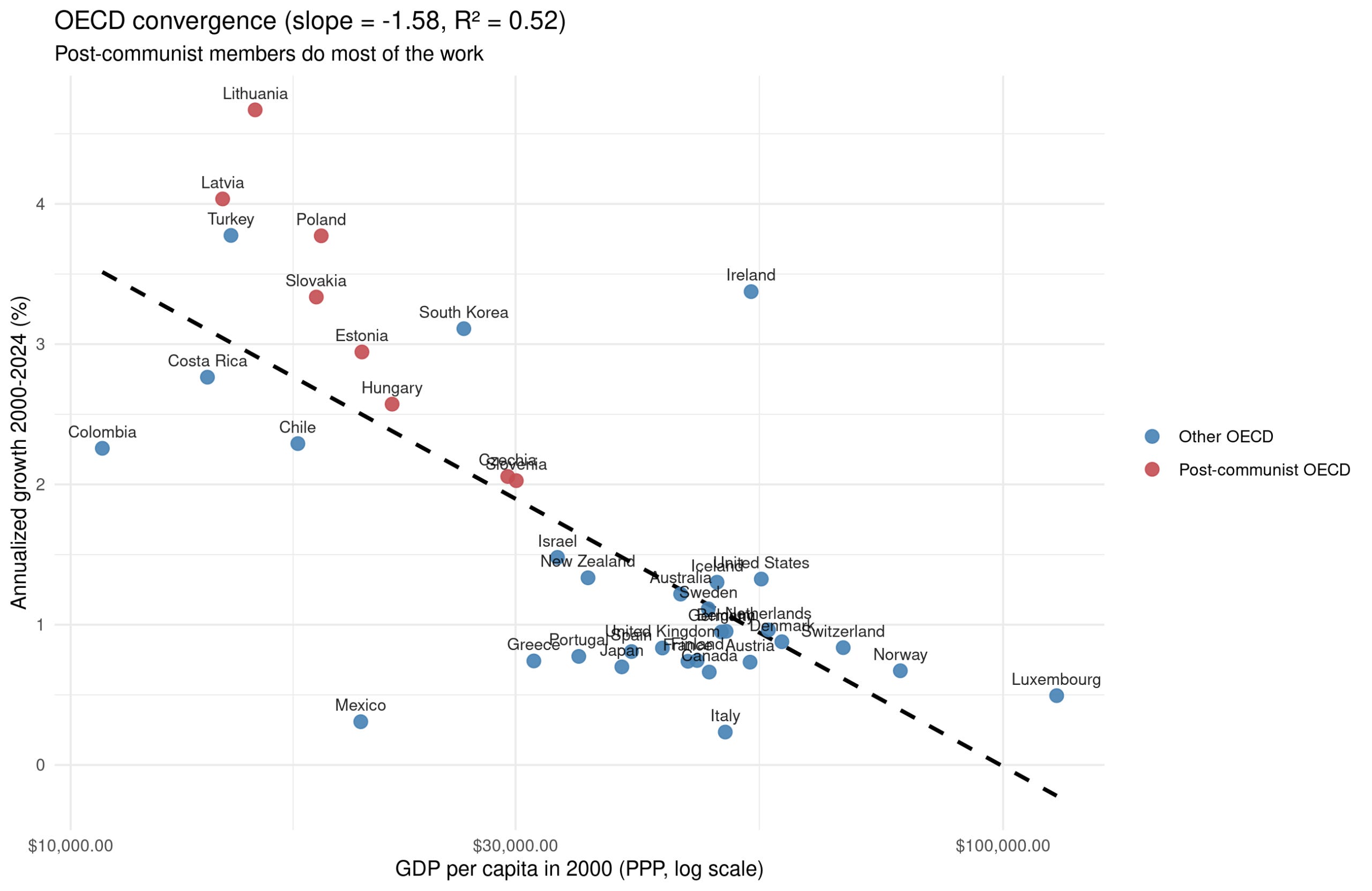 This kind of pattern is usually called the advantage of backwardness. The idea is that if your country is current poor, it is easier to copy working technology and policies from more successful countries, and since copying is easier than inventing, your growth will be faster than theirs, all else equal. We see this clearly in the OECD countries. Many of the countries are dealing with the legacy of communism which retarded their economic growth, so they are catching up to where ‘they should be’ (would otherwise have been).