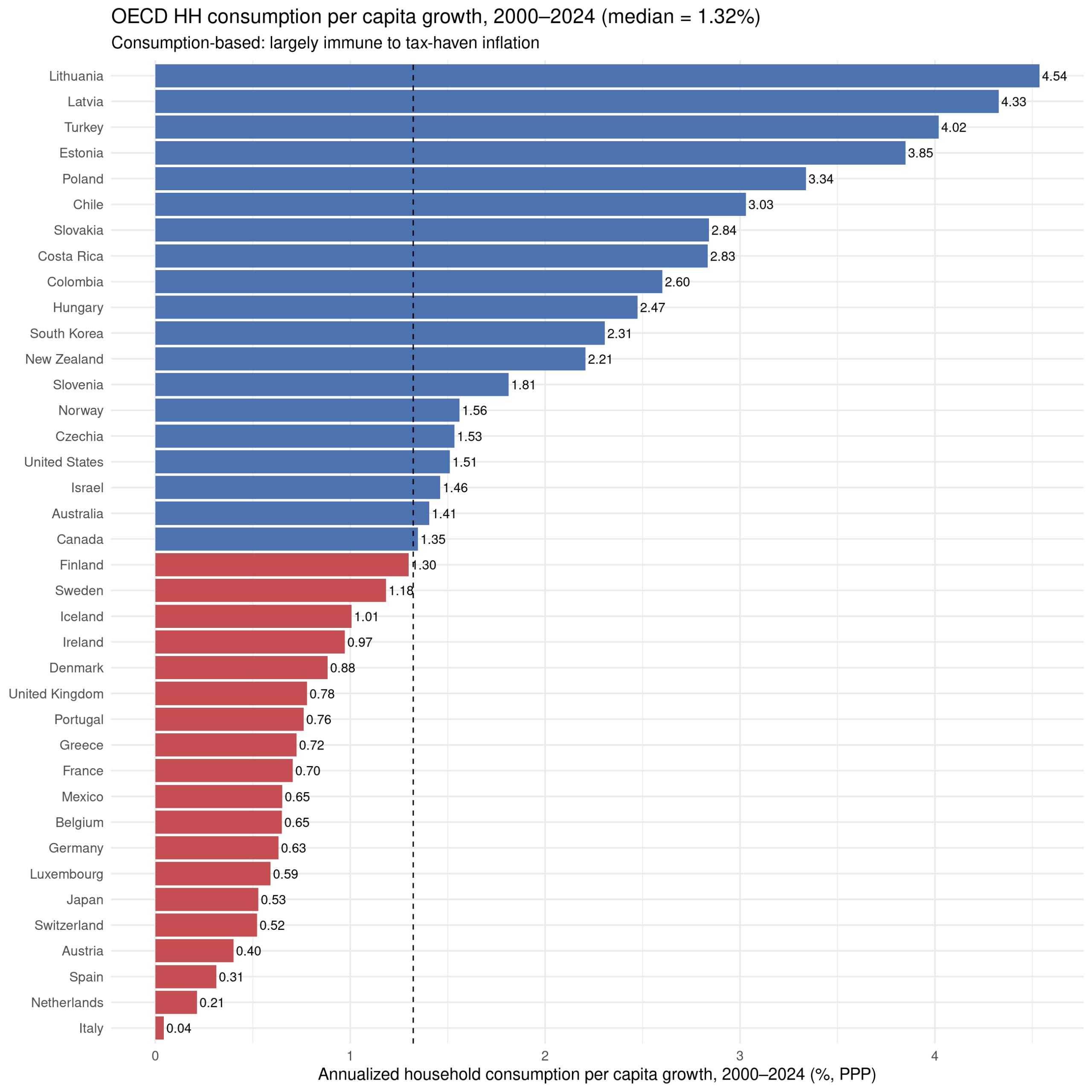 These results are somewhat affected by the usual GDP issues relating to tax haven (Ireland etc.). There are various ways to avoid this, but a simple one is using household consumption data: