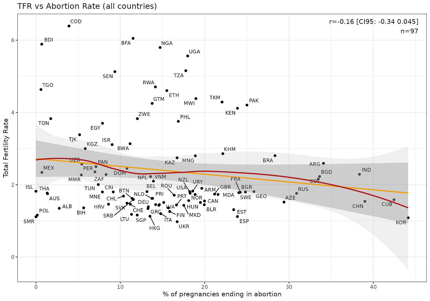 In neither case is the relationship stronger than chance level, despite we knowing that it has a causal effect. It tells us that abortion rates per pregnancy is not the cause of national differences taken as a snapshot (cross-sectional). Clearly, what matters must be the other part of the equation, the pregnancy rate: