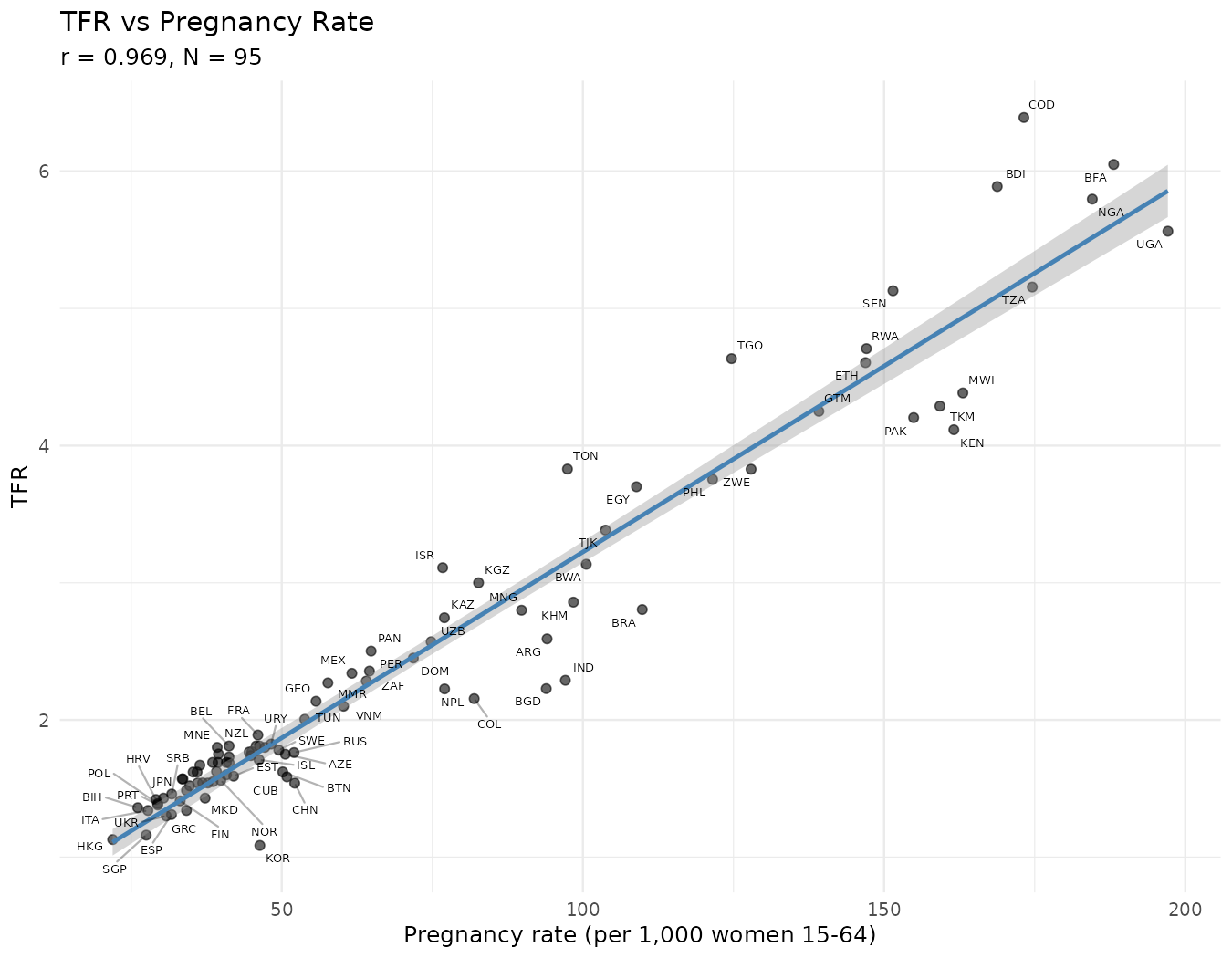 Our pregnancy rate uses women aged 15-64 as the denominator (from WDI), while TFR sums age-specific fertility rates over ages 15-49. This creates a systematic wedge: countries with older/younger age structures will have different ratios of TFR to our computed pregnancy rate. The multiplicative model TFR ~ preg_rate * (1 - pct_abort) achieves R² = 0.98 cross-sectionally and within-R² = 0.90 in the panel, with the residual largely attributable to this age-structure mismatch.