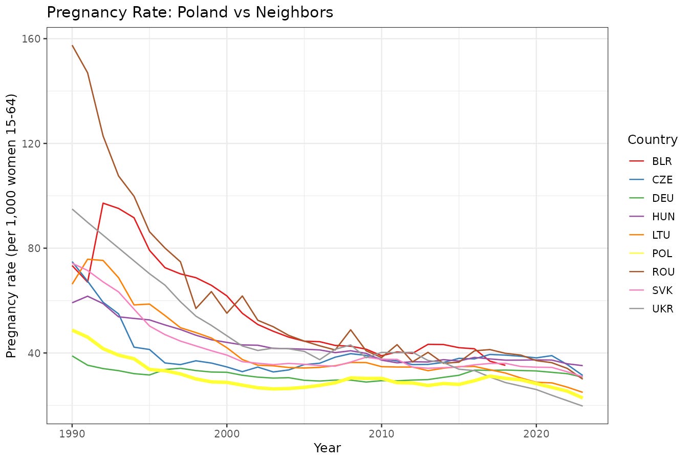 Poland reports ~1,100 legal abortions per year. Estimates of actual abortions (including travel to neighboring countries and underground pill use) range from 80,000-150,000. This means Poland’s pct_abort of 0.3% is a massive underestimate; the true figure may be 10-15%.