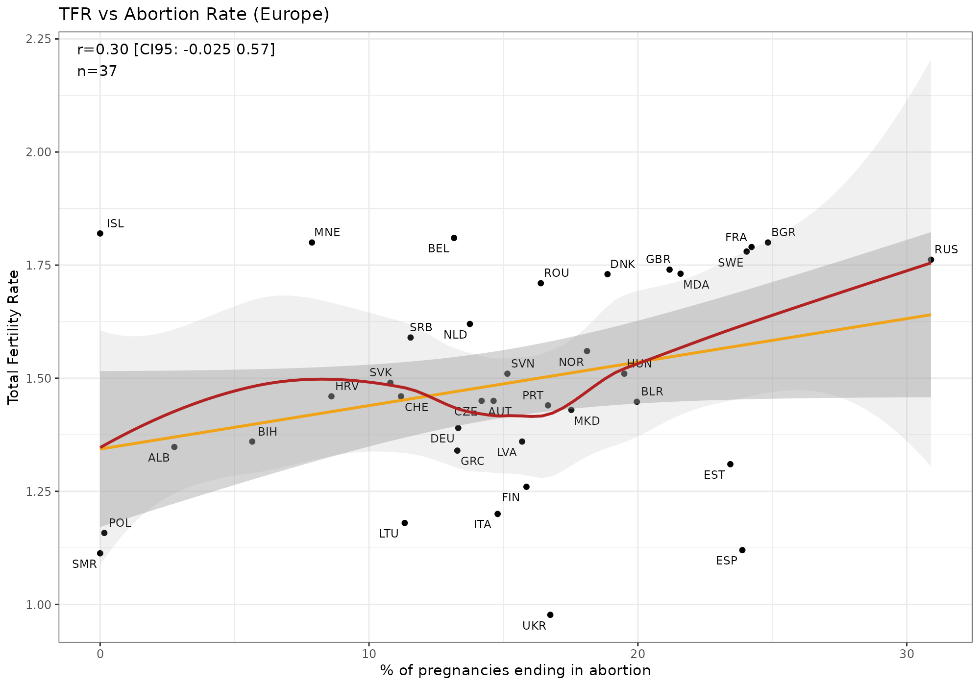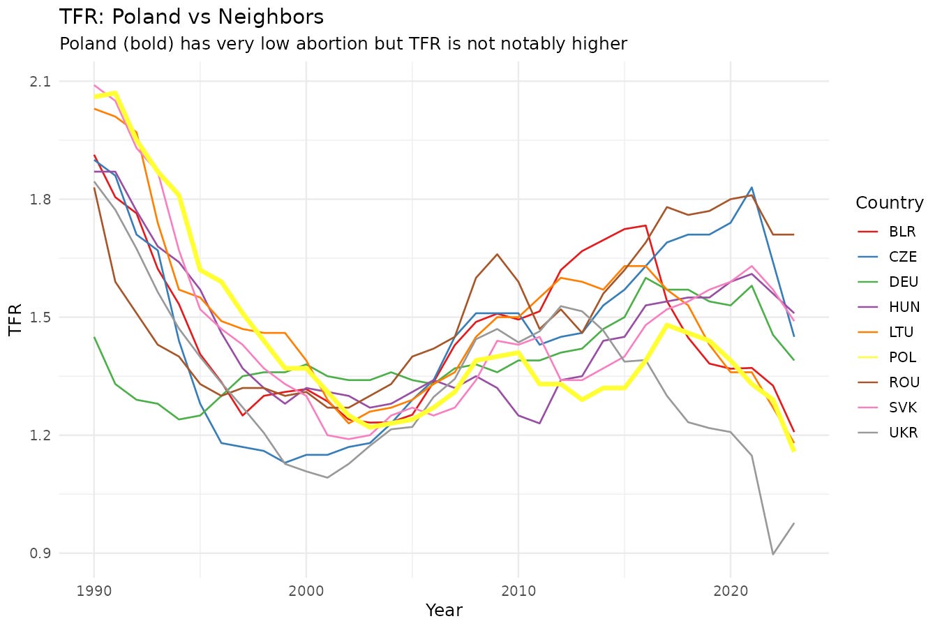 Countries above the regression line are those with few failed pregnancies, whether from abortion or miscarriage. If you look closely you can see that Poland is a bit above the line. And in general, Poland does not have higher TFR than its neighbors: