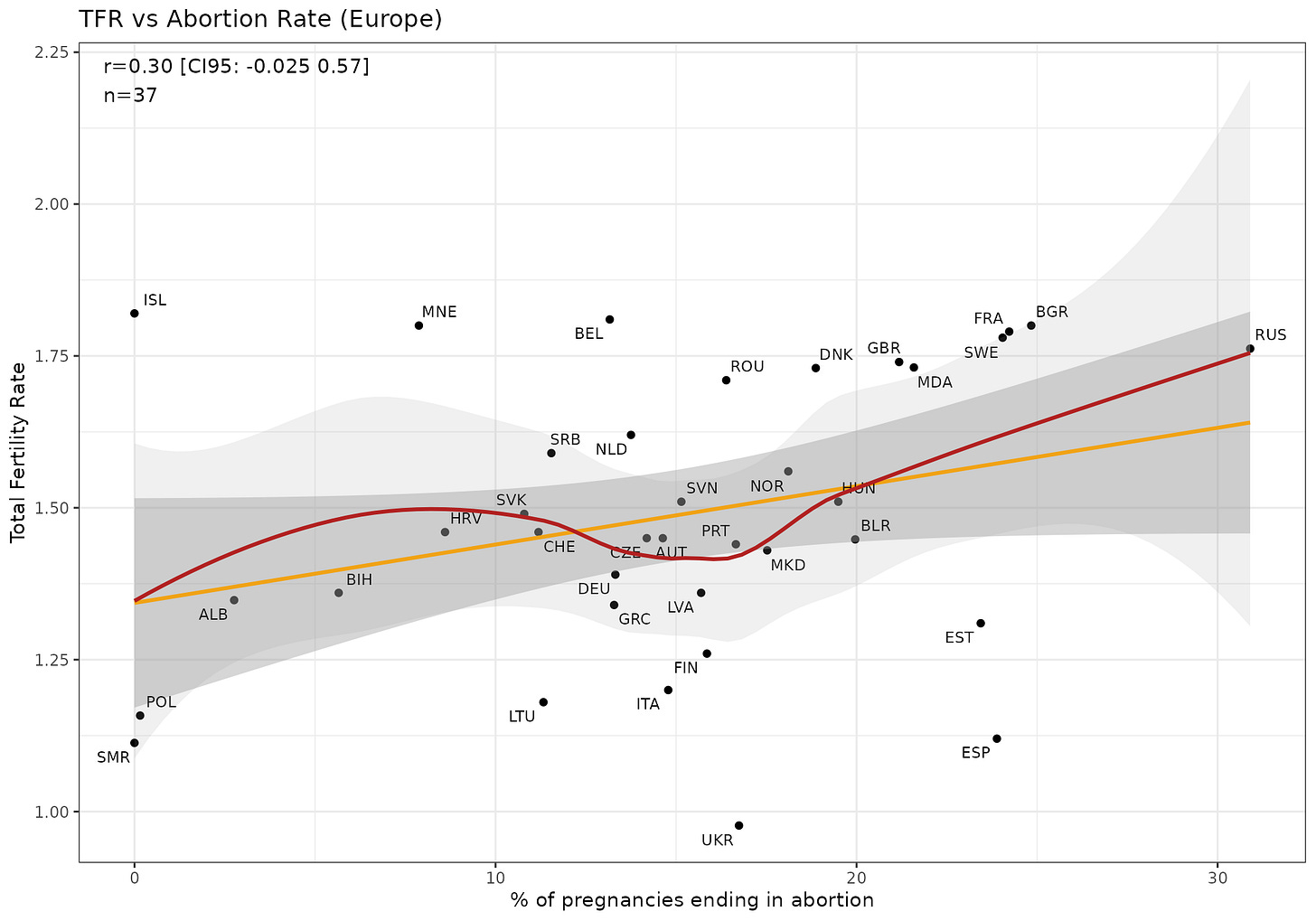 The newer map shows Portugal now has a higher rate, and Poland is still the big outlier together with Austria (in their data). I think these rates are based on abortions in that country, so does not include medical tourism, which is now very easy to do. Poland’s effective rate is thus much higher than the <2% seen here. Naturally, abortions lower the fertility rate, so you would expect that if we plot these together, we get a decent negative correlation: