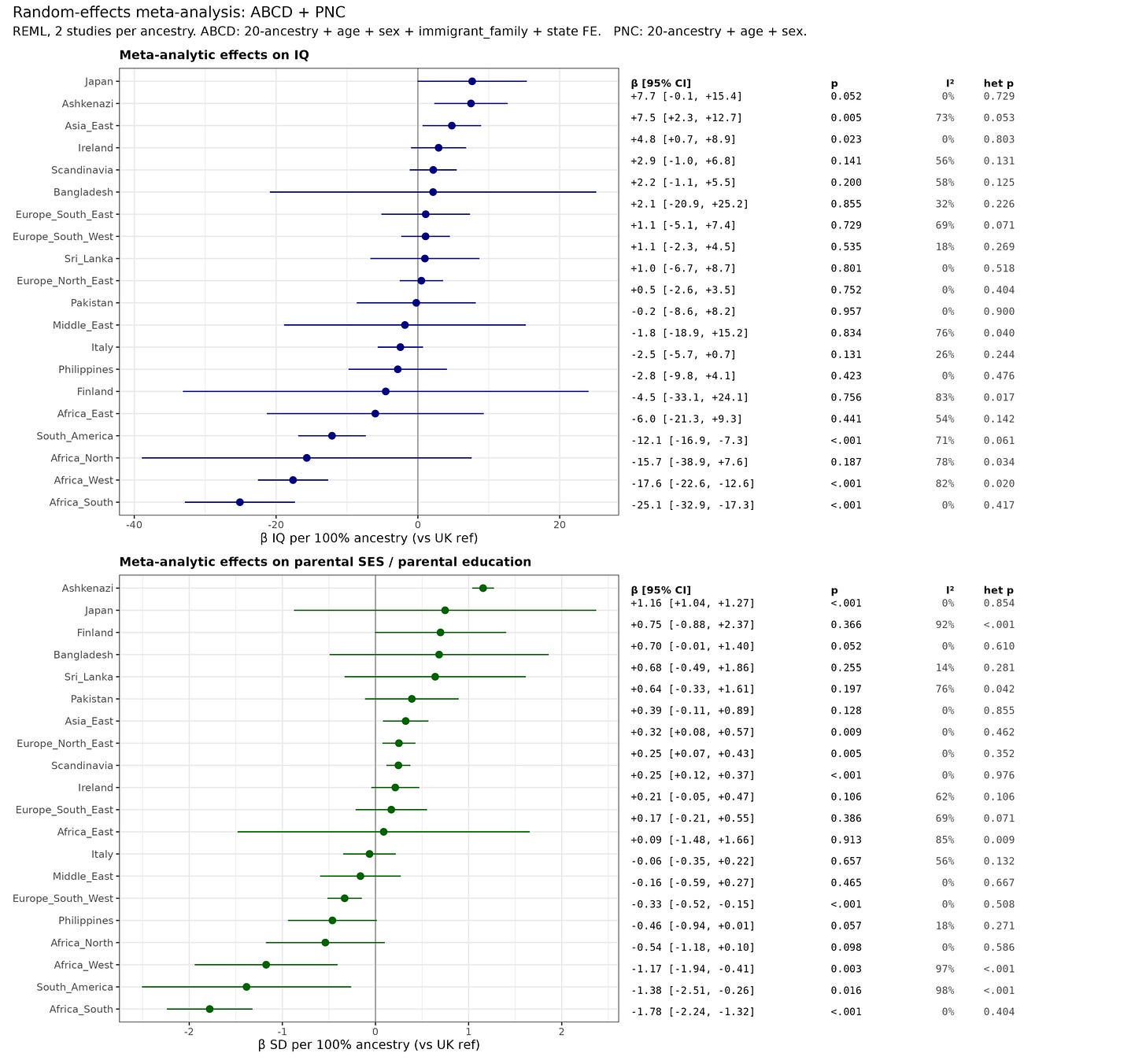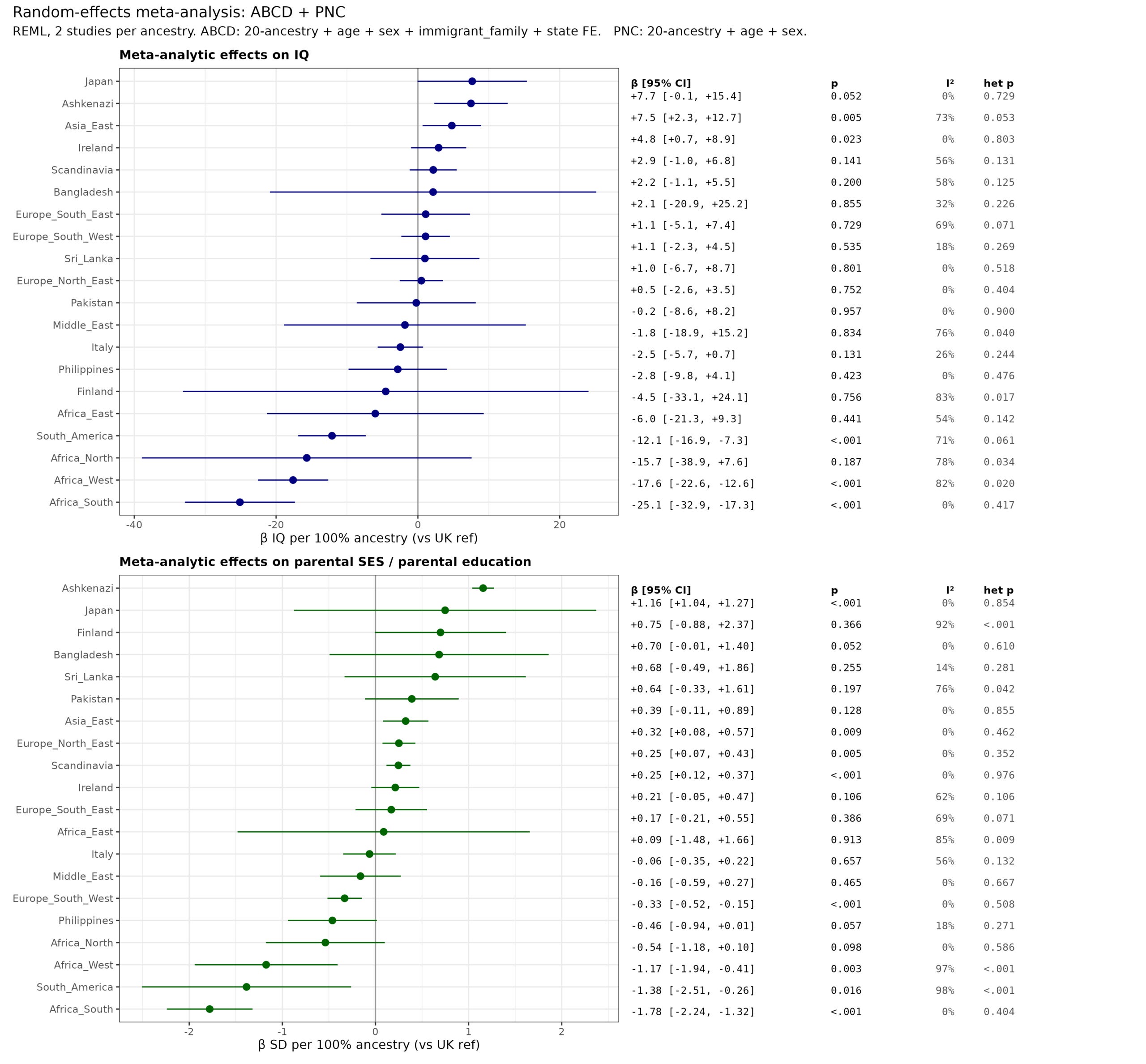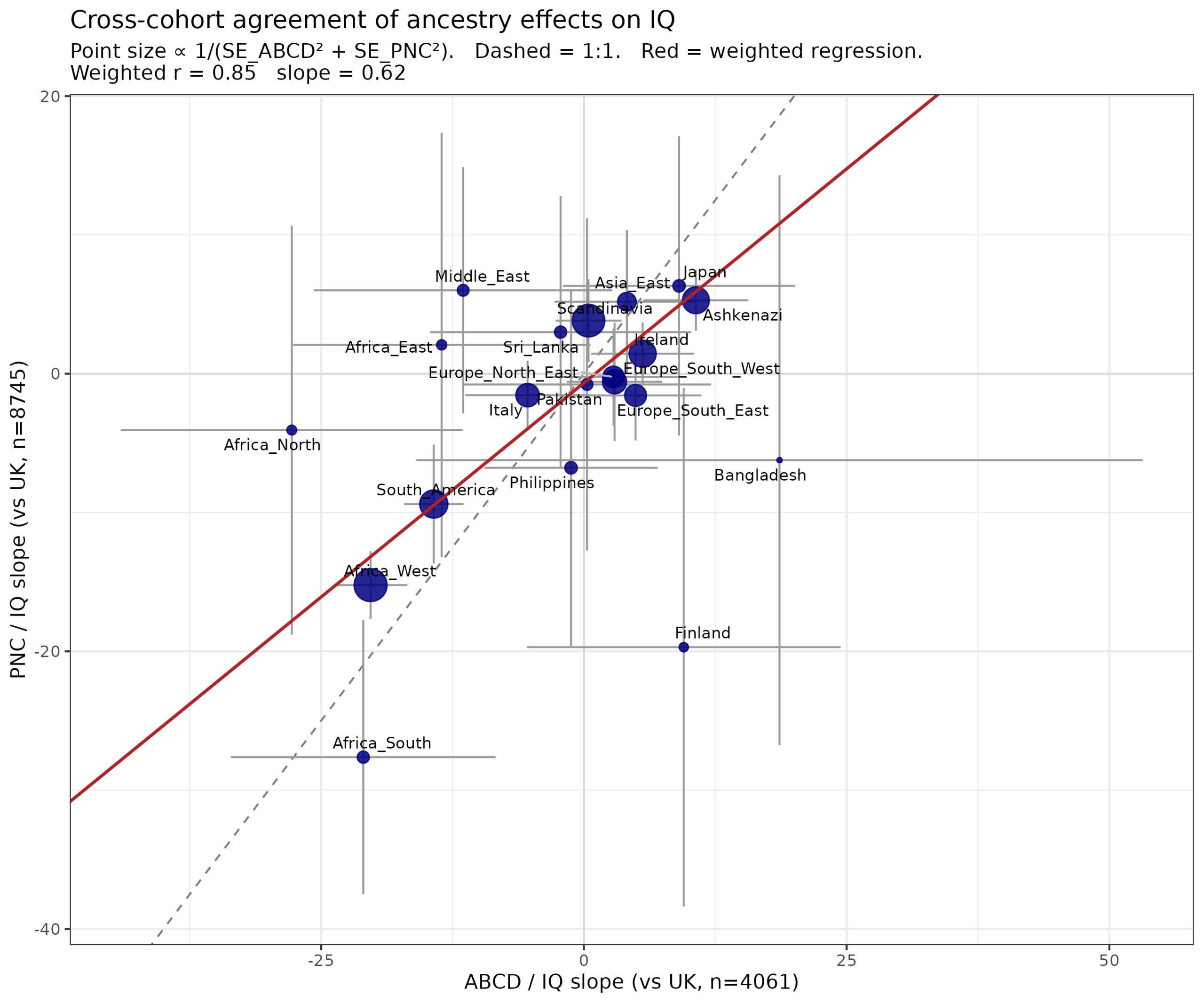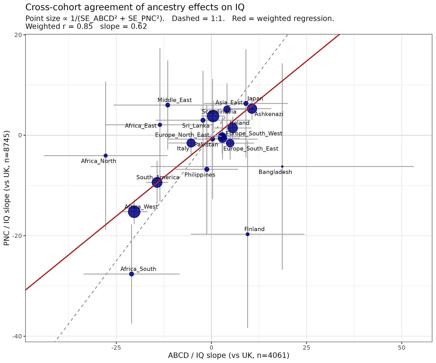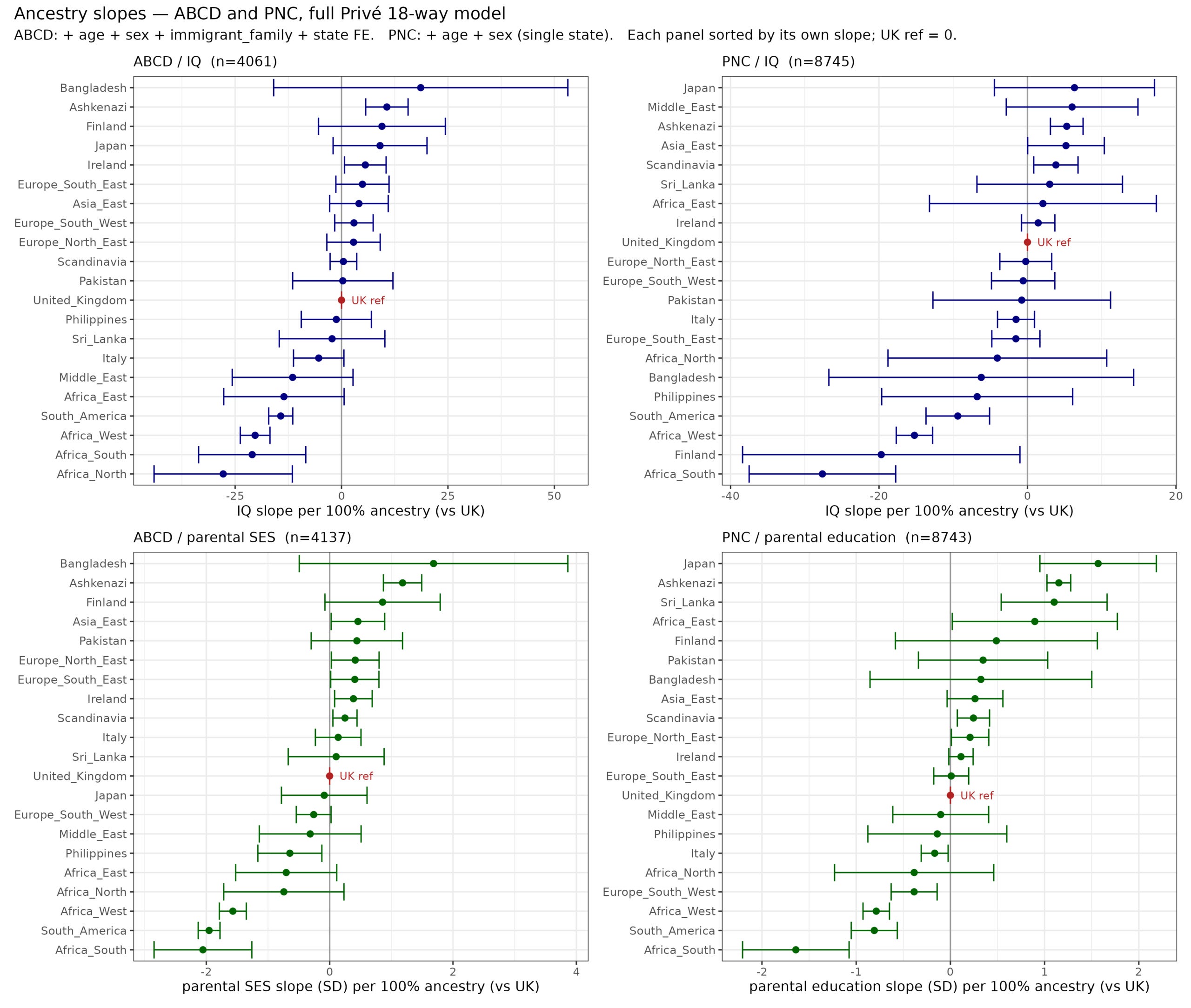 Today we want to move the science forward a bit by presenting 2 admixture studies. The datasets are the ABCD and PNC, both large US samples. The first is nationally representative and the latter is from the Philadelphia area (east coast). Ancestry was estimated using the Privé 2022 pretrained models which provides estimates for 20 ancestries, including Ashkenazi. IQ was scored the simple way: first factor of good cognitive tests, scaled to 100/15 for Whites. Tests were age adjusted beforehand using splines. Parental education or socioeconomic status was also calculated as an alternative outcome. The main results for ancestries were, with British Whites as reference: