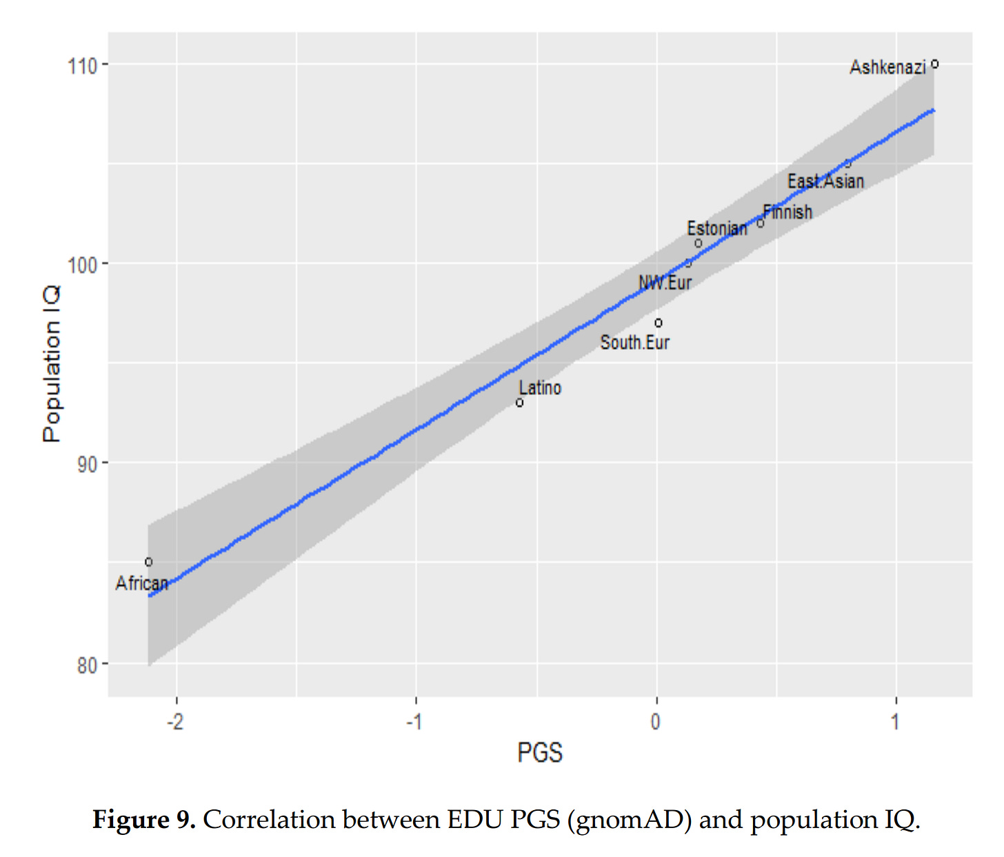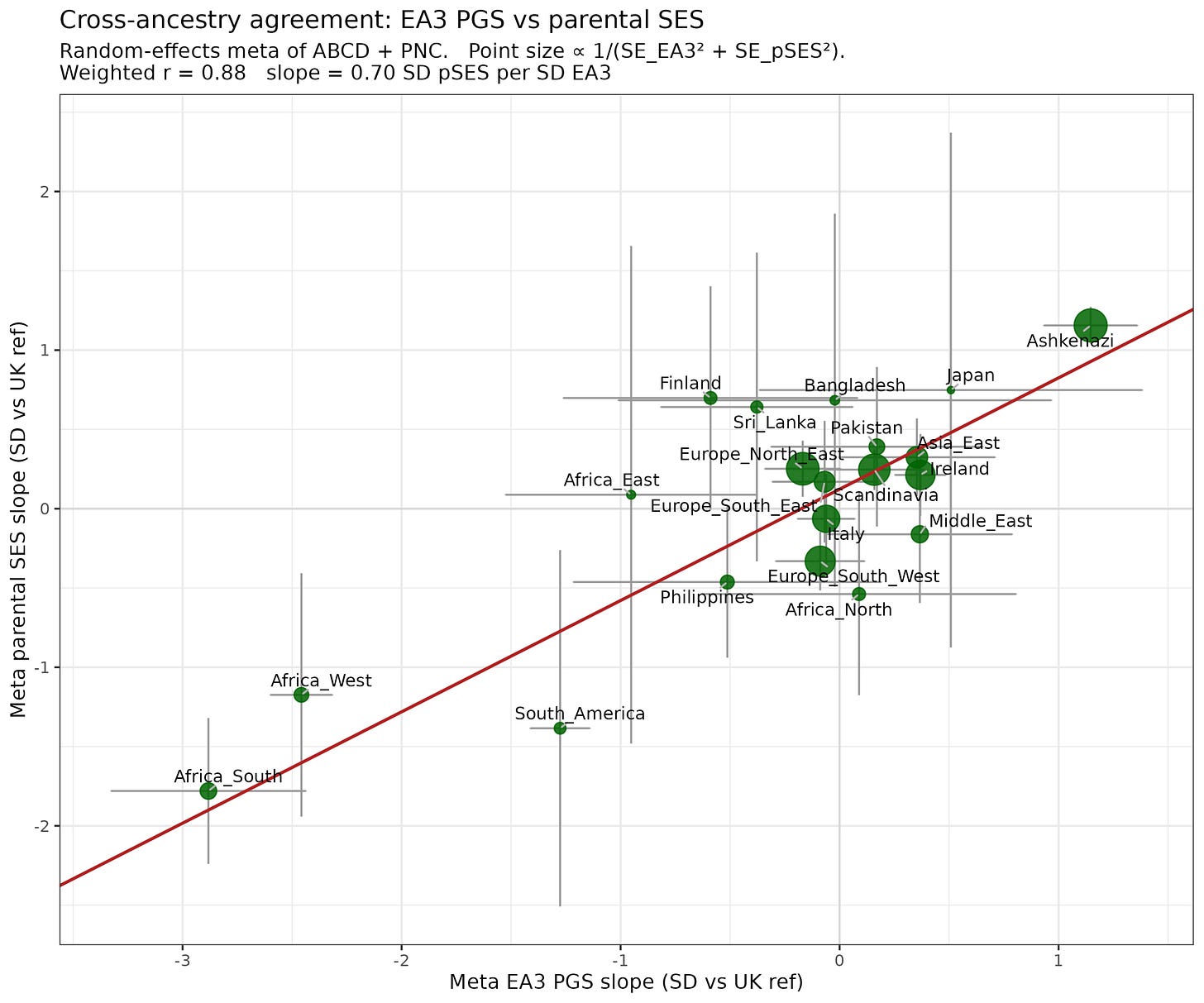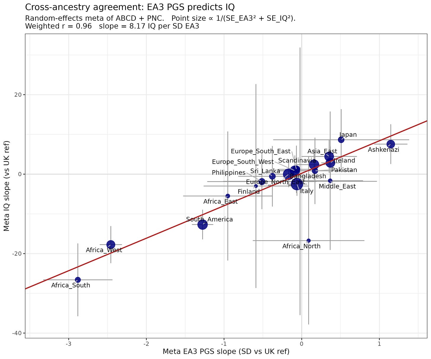 Zooming out, we can estimate the mean PGS, IQ, and parental SES combined across datasets. This gives a kind of group-level plot for genetic potential of ancestries vs. their estimated IQs: