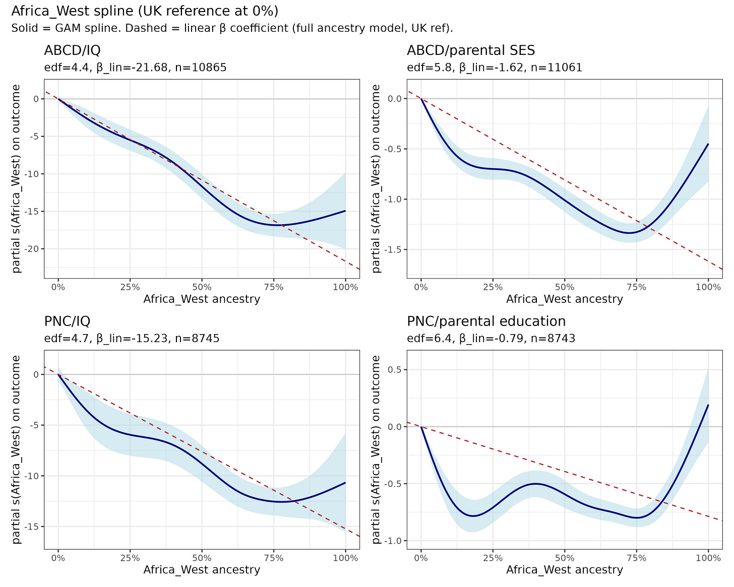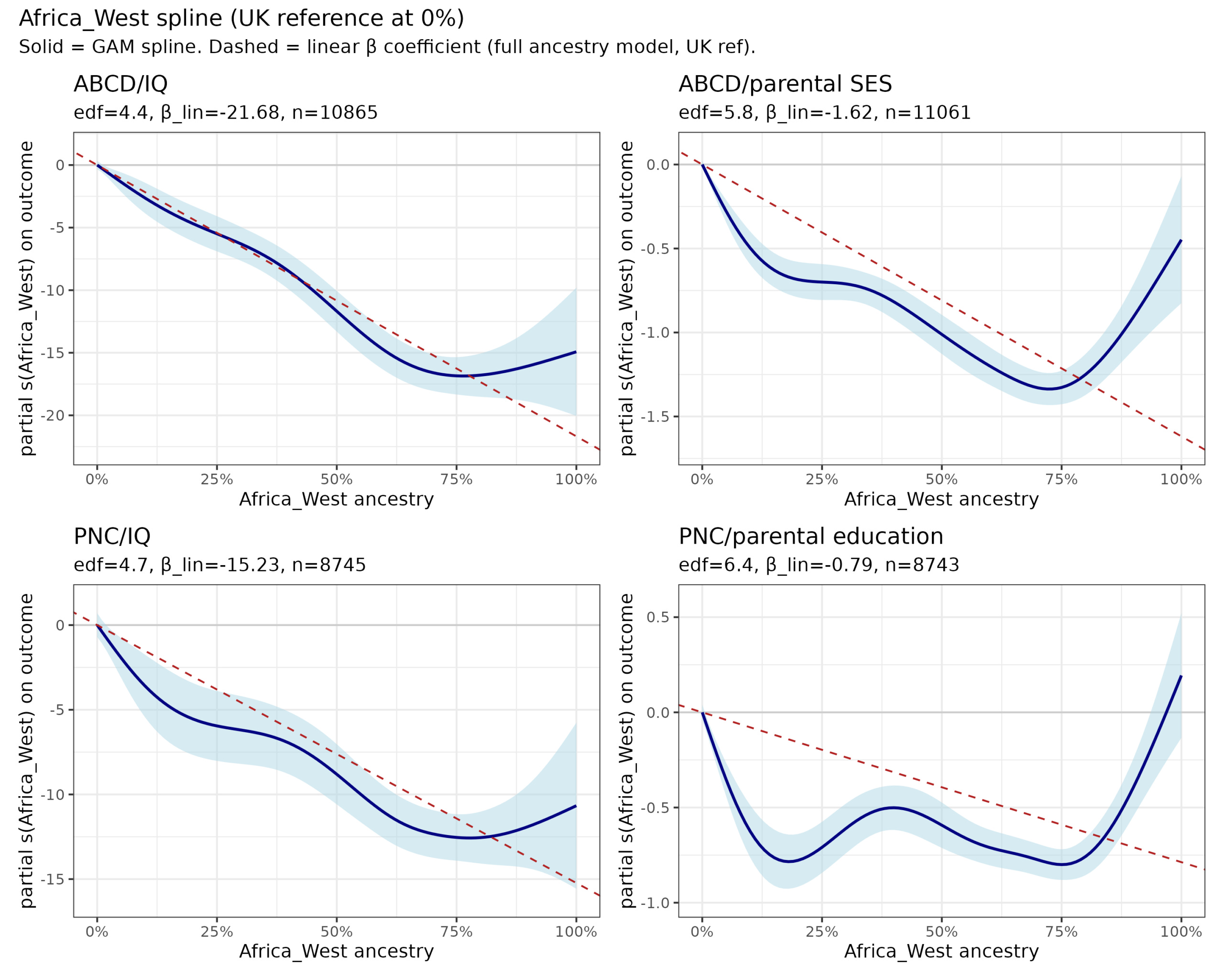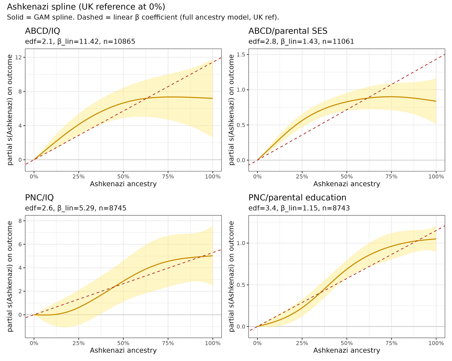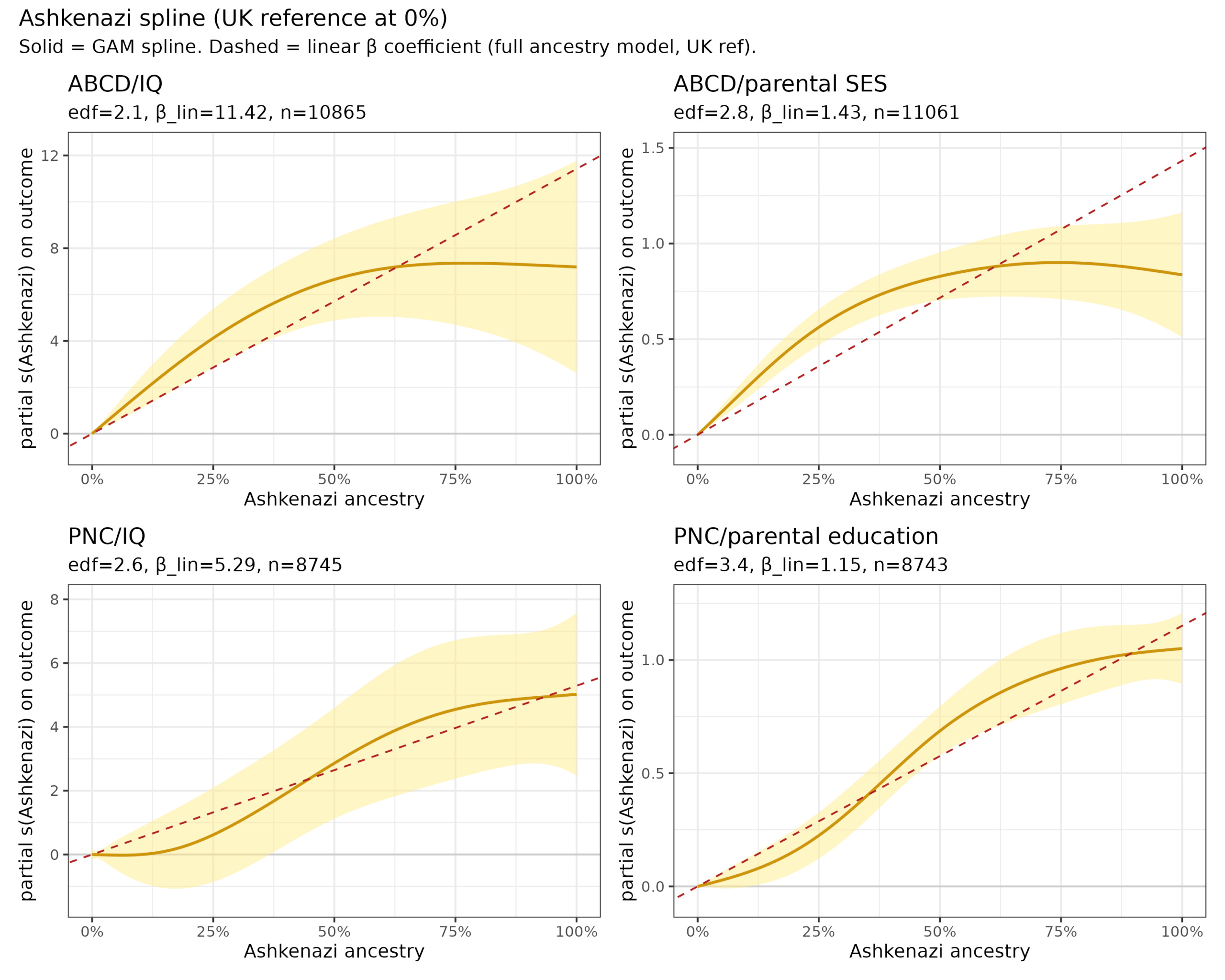 The estimated slopes are similar to our published results using a simpler k=5 model (European, African, Amerindian, East Asian, South Asian) for those ancestries. The Jewish samples aren’t great. There are ~300 Jewish genomes in ABCD and 477 in PNC. These are sums of fractional ancestry, not counts of pure Jews. Of those with 50%+ Jewish ancestry, there are 117 in ABCD and 344 in PNC. This should be sufficient to estimate slopes with some precision. The bigger issue is that there are nonlinear effects: