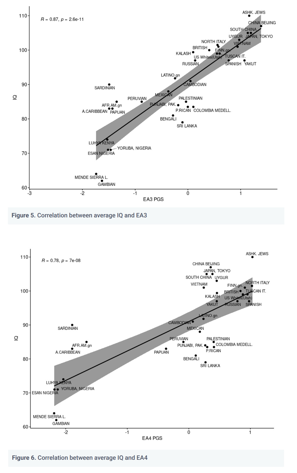 The usual caveats apply to the polygenic scores. These are trained on Europeans and have weaker correlations for the other groups. EA4 shows mean bias for Africans, which is also why I used the EA3 in the last 2 plots even though it’s a subset of EA4 (the correlations for EA4 are 0.81 and 0.69). One could apply Piffer’s filtering method here but I leave this for future research.