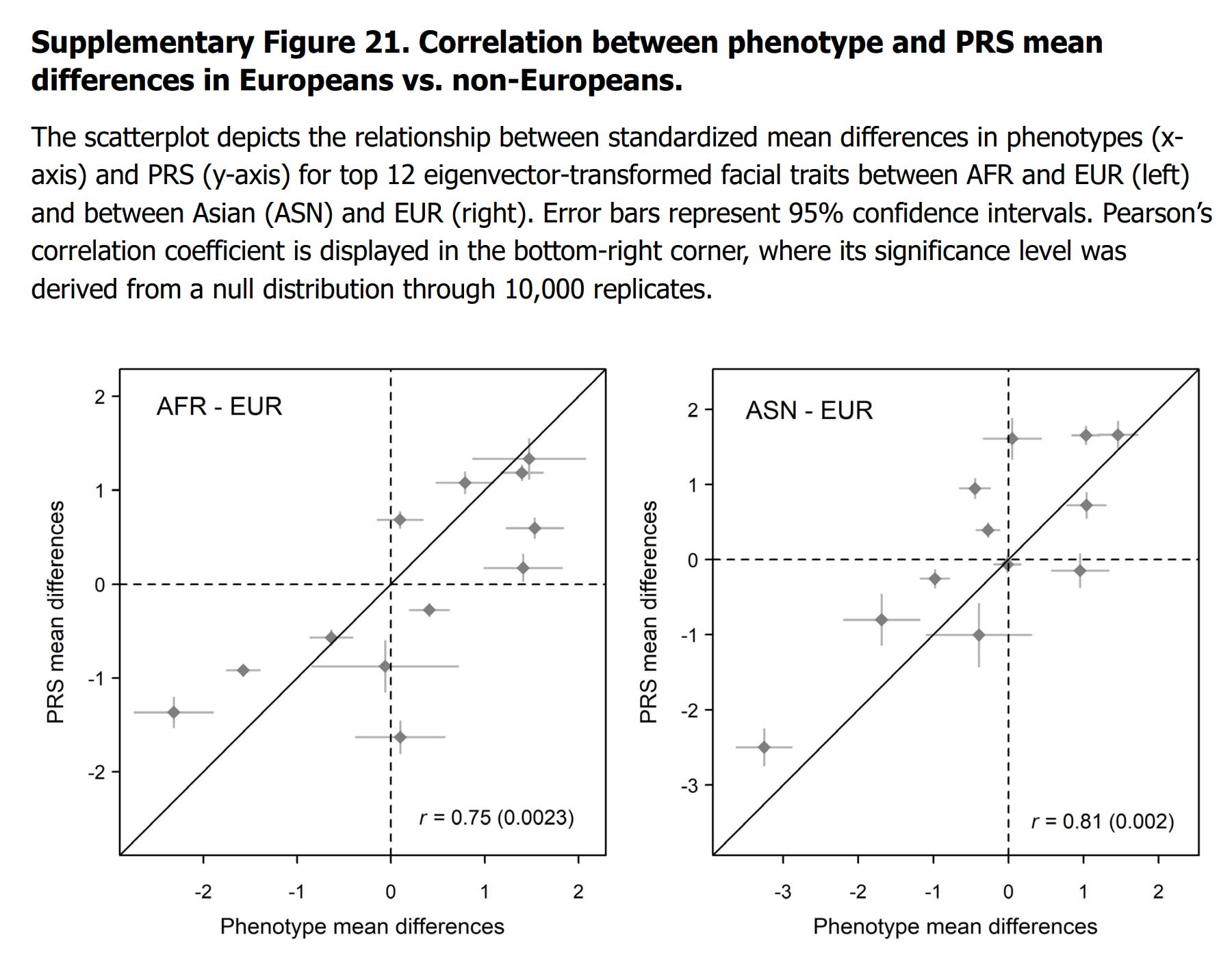 To be noted here, the dataset they had is the reverse structure of what we normally work with. Normally, we have only a few phenotypes+PGS combinations (EA, IQ, height, BMI) but many samples (worldwide, or subnational regions). They did the opposite, many phenotype+PGS pairs and only pairs of groups (3 groups total). So their analysis was whether the polygenic scores correctly identify the correct differences among two pairs of populations (Europeans vs. African, Europeans vs. Asians) across many phenotypes, whereas we regularly work with testing whether the polygenic scores correctly rank order many different populations or subpopulations on a single phenotype. The latter method is more challenging because the use of many populations make worries about population stratification worse.
