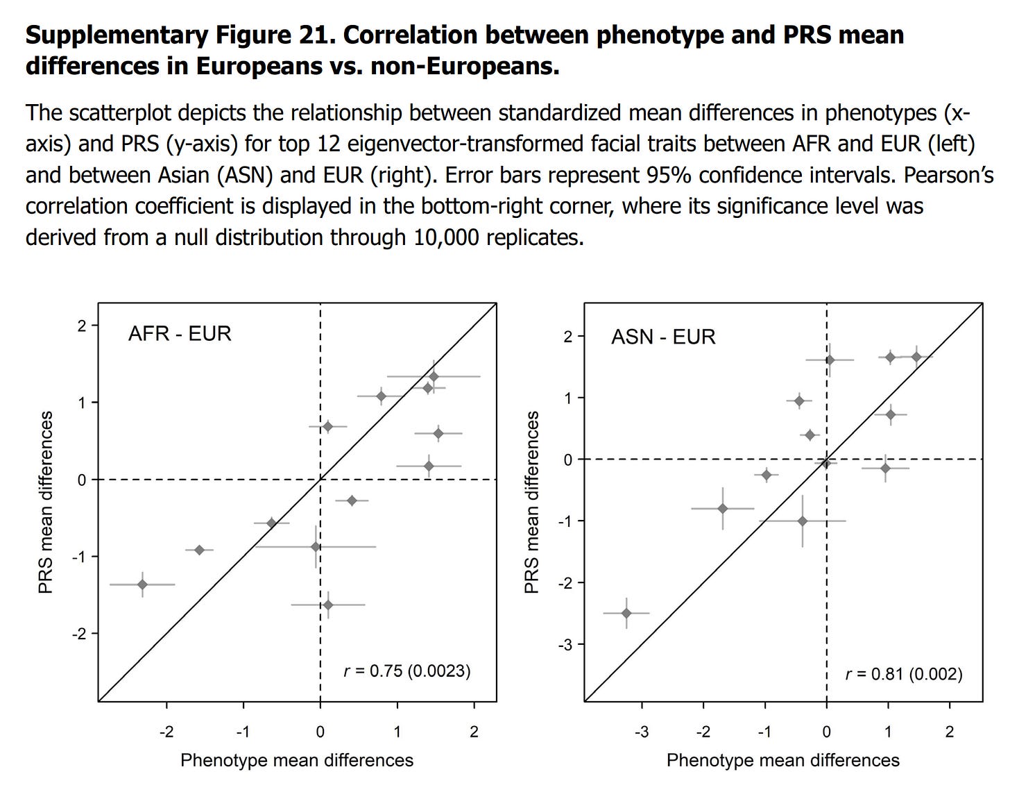 Recall that you need to use the square root of these values to interpret them properly. As such, in the best case scenario, a correlation of r = 0.28 was obtained between a genetic prediction and the landmark values among faces. This is not too bad, and is enough for group-level comparisons and even embryo selection. The authors elaborate: