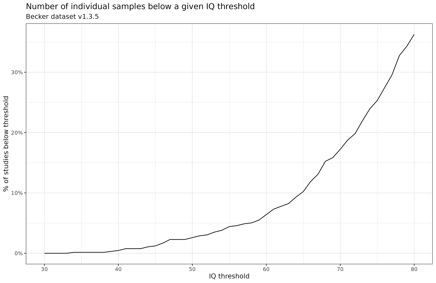 This change was made later in the Becker dataset, not the Lynn 1978-2012 datasets. Why? Well, critics had complained about unreasonably low IQ results for some countries. So Becker decided to impose a floor based on the idea that the results below that were probably due to problems of measurement. Now another critic says imposing a floor is also bad. You can’t win with these people. Speaking of Nepal, I found a large well-done study investigating a nutritional intervention for pregnant women. It produced no effect of the intervention and a mean IQ of 78. Since this is close to that of India and Afghanistan, it’s more sensible than the studies reporting values in the 40s. Other hereditarians have since reported other samples with such low scores, suggesting measurement issues (South Sudanese sample). Subjects may not care about the study, so they don’t try at all, or the instructions weren’t explained properly. Raven’s items requires sustained effort to solve, and if the test is already hard for you, why bother? Who knows what went wrong in a particular study. In any case, if you don’t apply the floor of 60, nothing much changes about the overall pattern. Becker provides comments on the revisions of the dataset and the plausibility of the <60 values on his blog. There’s a setting in his absurdly large spreadsheet that changes the minimum (in the SET sheet). Here’s the % of samples reporting values below a given threshold: