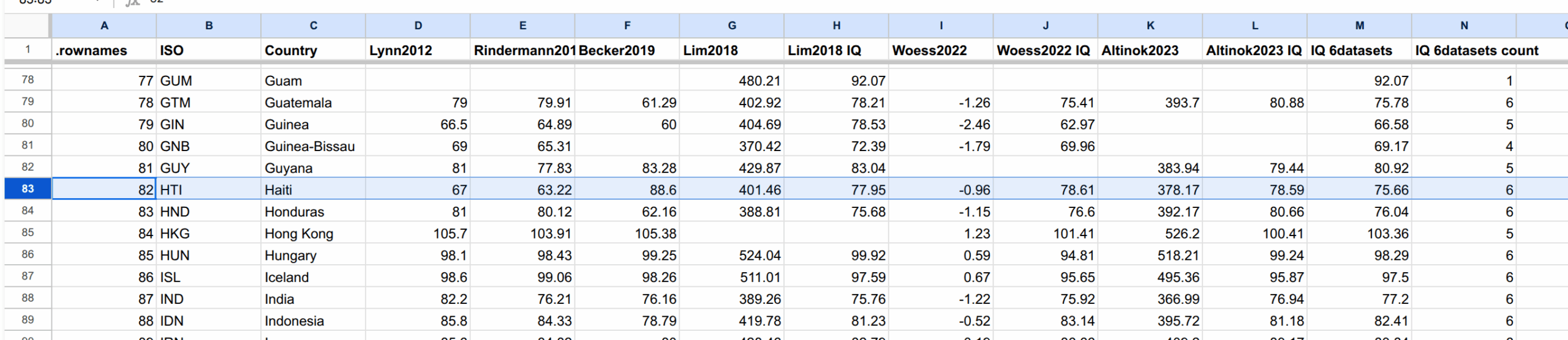 We see that generally for countries with IQs below 80 or so, there’s probably a nontrivial amount of error in the estimate of it’s national IQ. You can also discern certain patterns in which countries have more uncertainty. In the top near 100 IQ we have Vietnam, a communist country, and Cuba (CUB) is also above expectations. Haiti (HTI) has significant uncertainty as you might expect. Generally, smaller countries and those beset with incompetent or authoritarian governments have higher uncertainty. This is not very surprising. We can also illustrate this by looking at Haiti’s estimate across different meta-analyses: